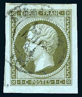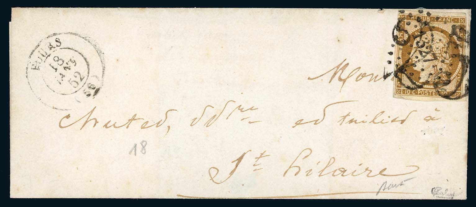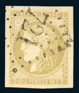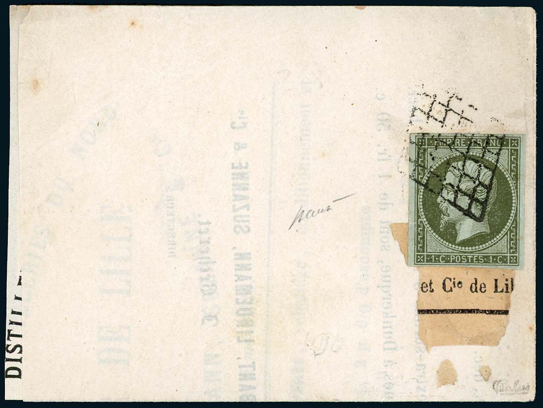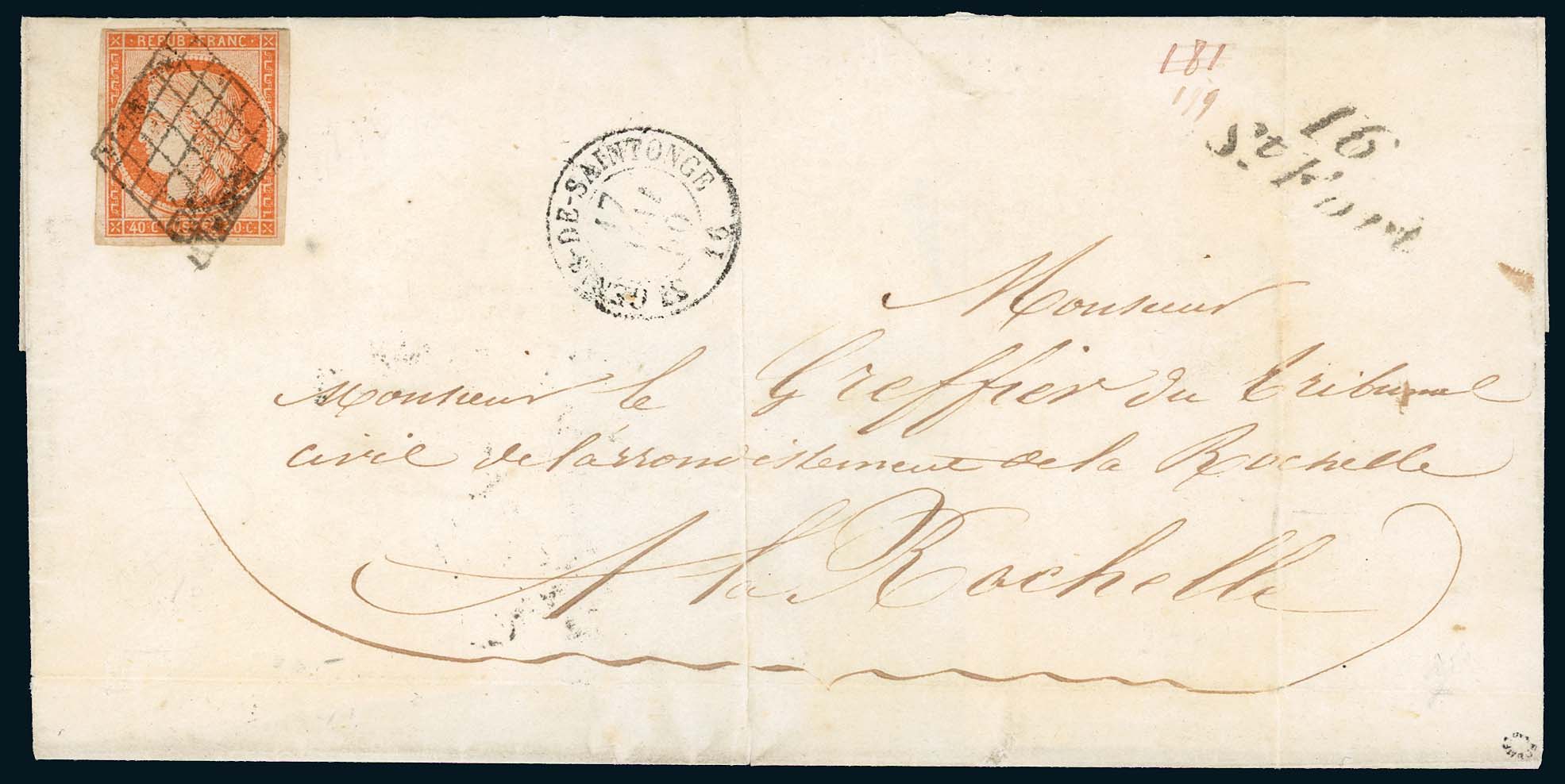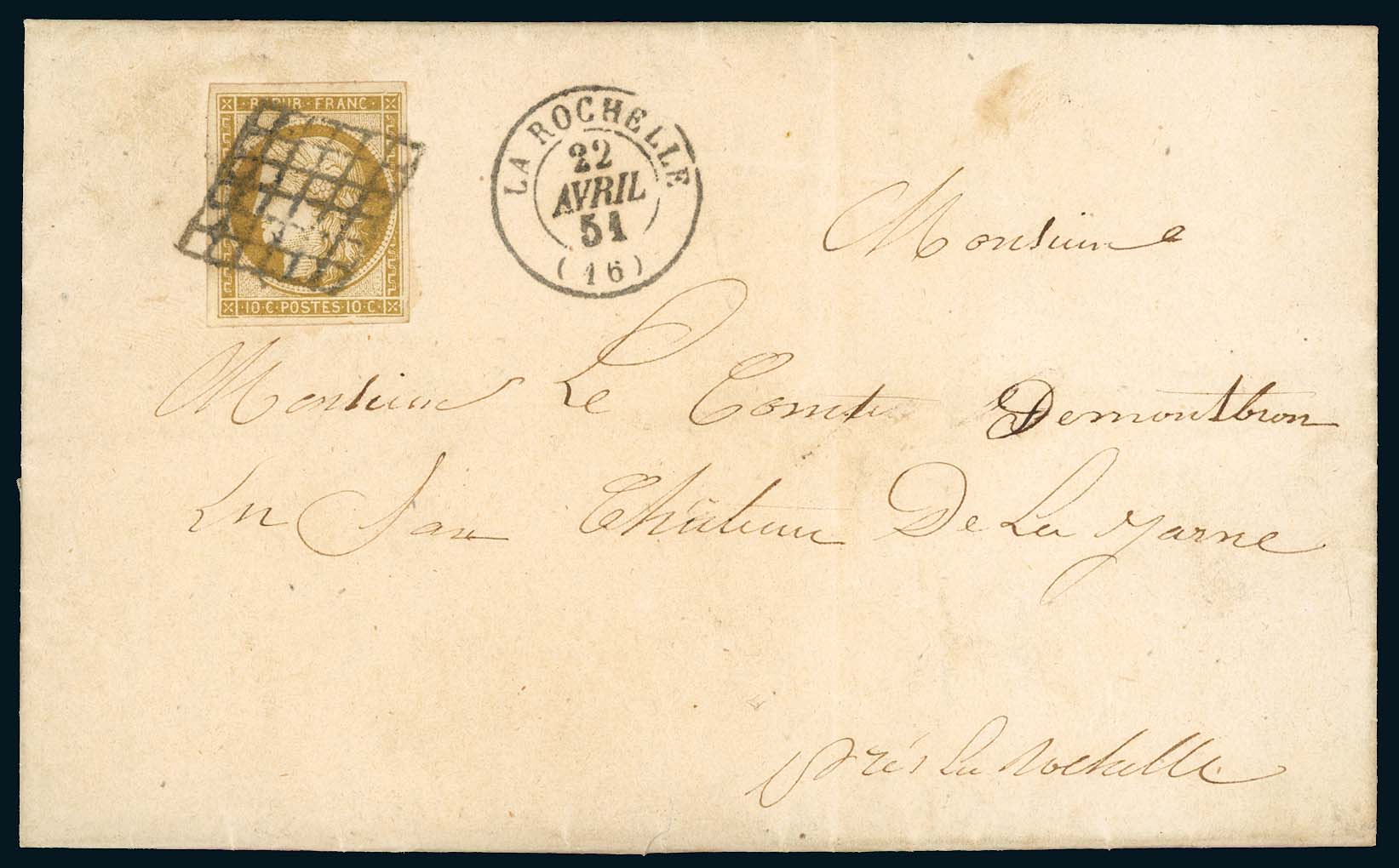 18 | N°1b, bistre-verdâtre oblitéré grille sur lettre locale de La Rochelle du 22 avril 1851, nuance très caractéristique TB/Sup | 250 | 400 | 250 | enchérir | |
