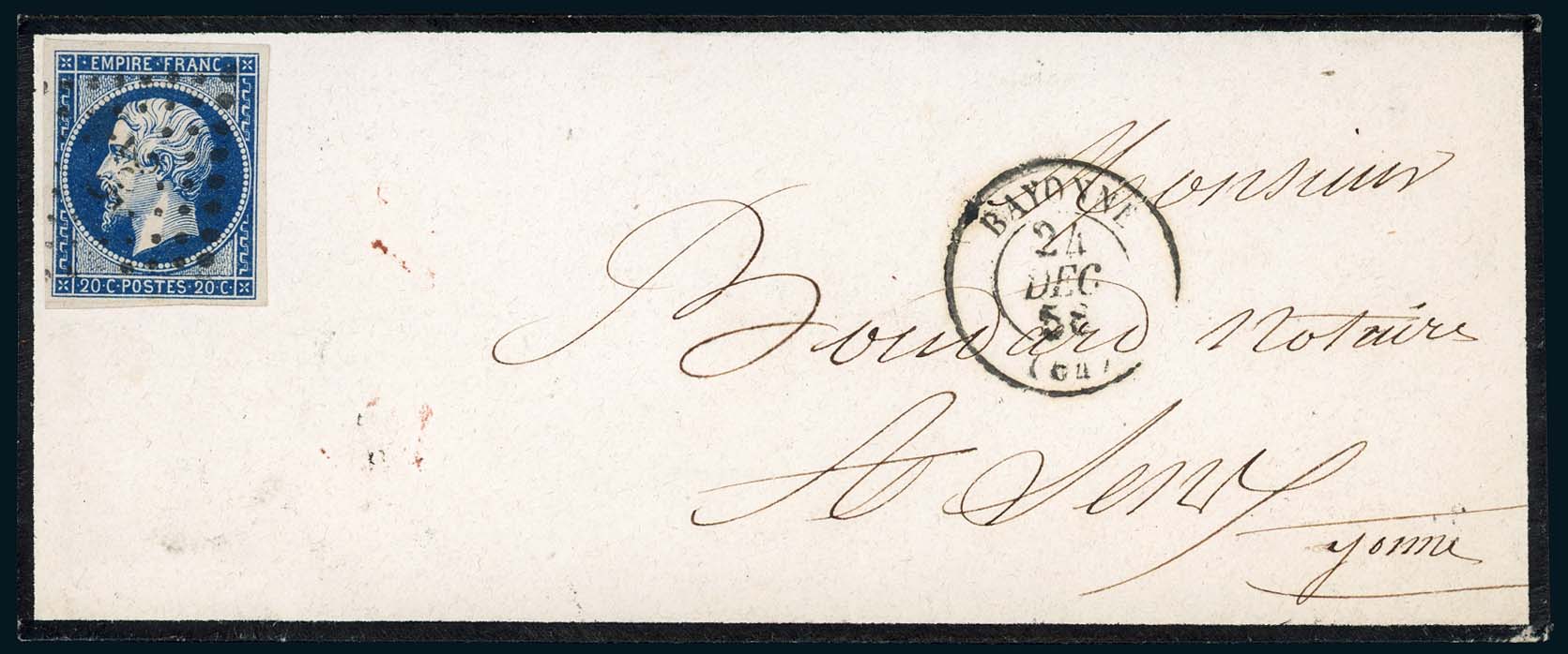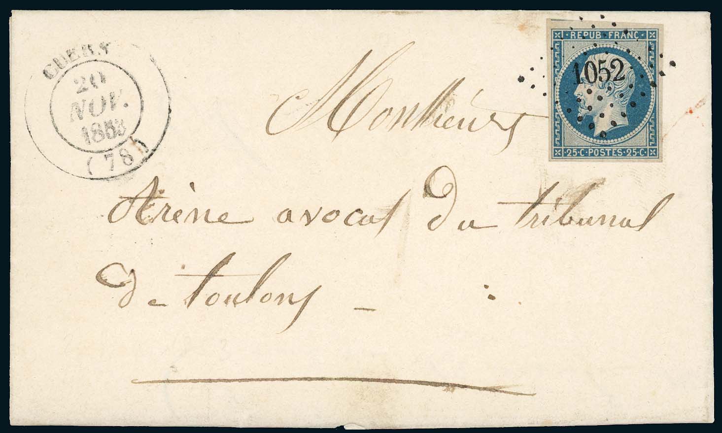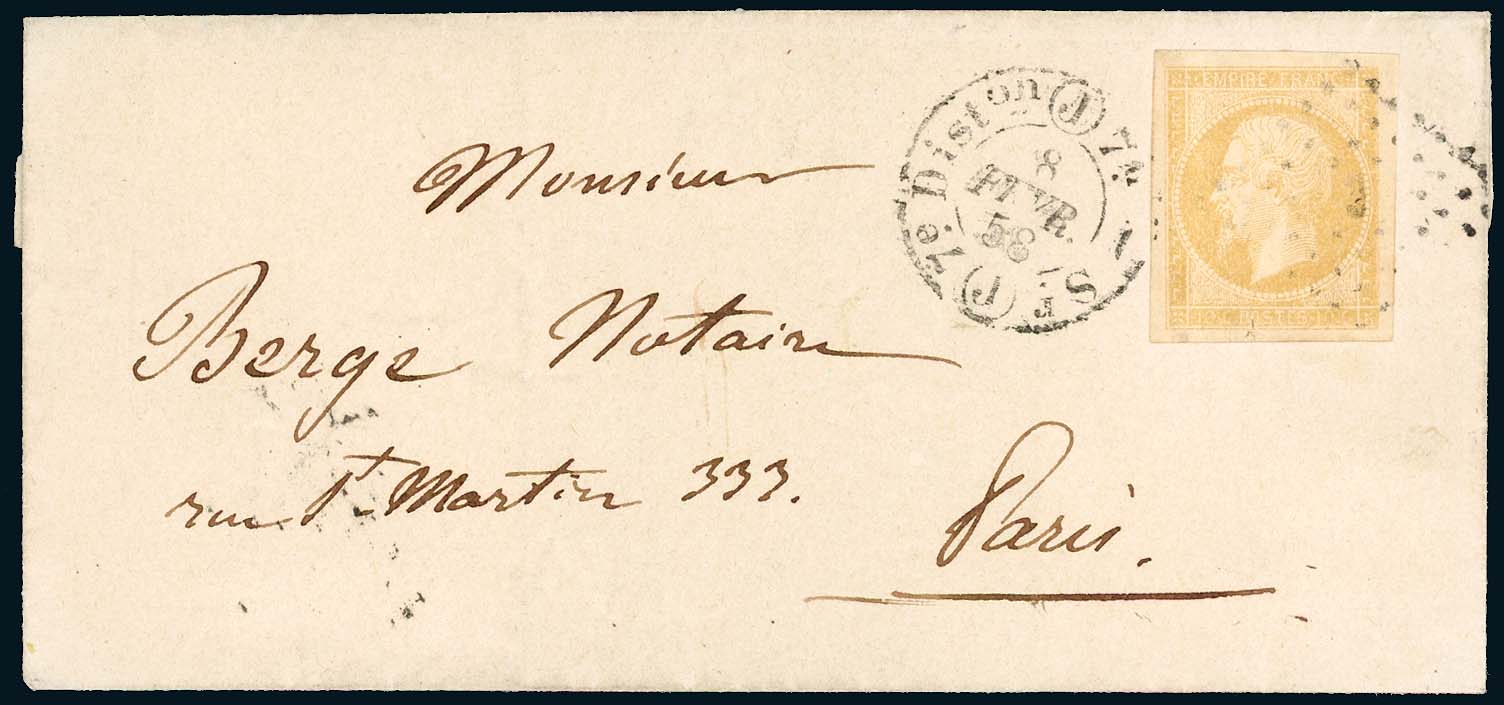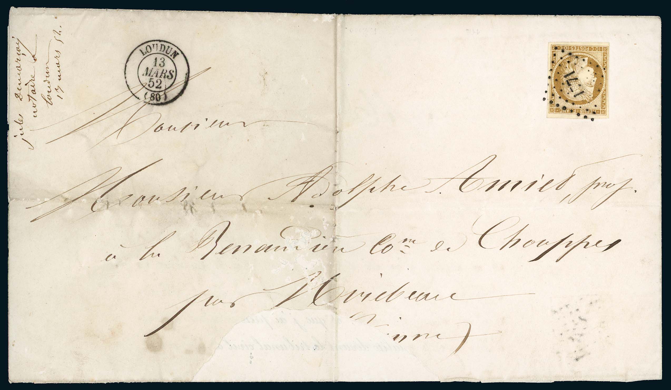 18 | N°1b, bistre-verdâtre oblitéré grille sur lettre locale de La Rochelle du 22 avril 1851, nuance très caractéristique TB/Sup | 250 | 400 | 250 | enchérir | |