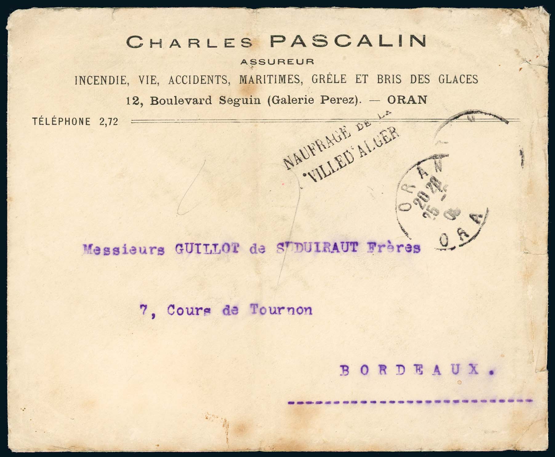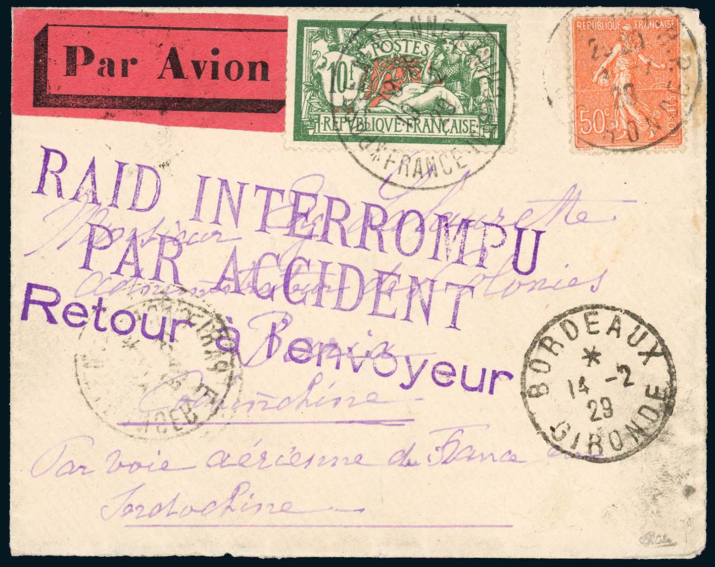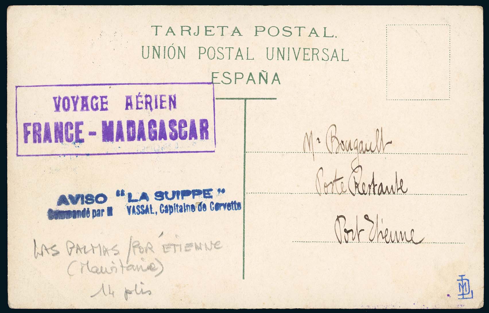 2399 | Raid France-Madagascar (cachet au verso avec celui de Berre/Aviation maritime) au départ de Berre. Carte postale adressée à Tanger, un des 12 plis transportés 11 octobre 1926 Rareté Superbe | 500 | 800 | 500 | enchérir | |
