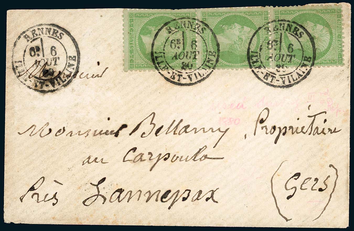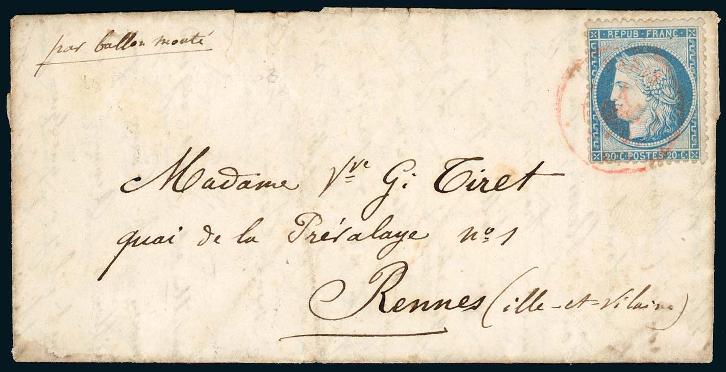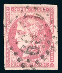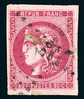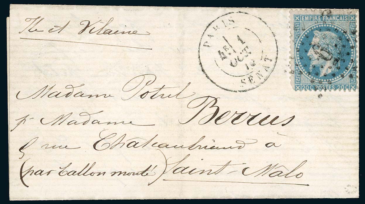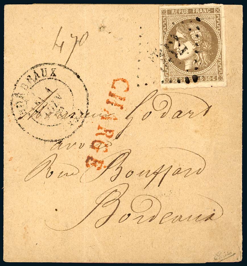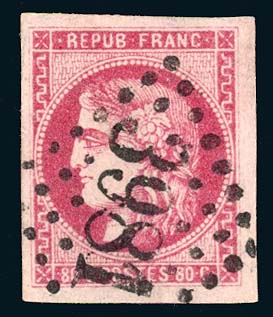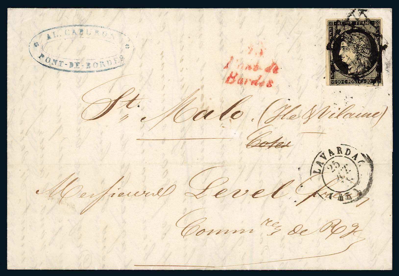 81 | N°3 OB grille C. LAVARDAC et cursive 45/Pont-de/Bordes en rouge sur lettre pour Saint-Malo avec C. ST MALO eu verso 1849 Rare TB | 150 | 250 | 150 | enchérir | |