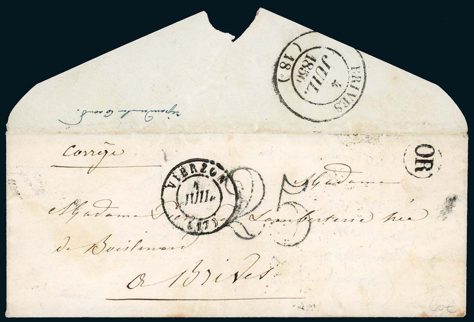 82 | N°3 OB grille, C. GRAY au type 15 du 30 juin répété pour l'annuler au type 13 du 1er juillet sur lettre taxée 05 à la plume, 1er jour du tarif à 25c, signé Calves 1 juillet 1850 TB | 75 | 120 | 75 | enchérir | |
