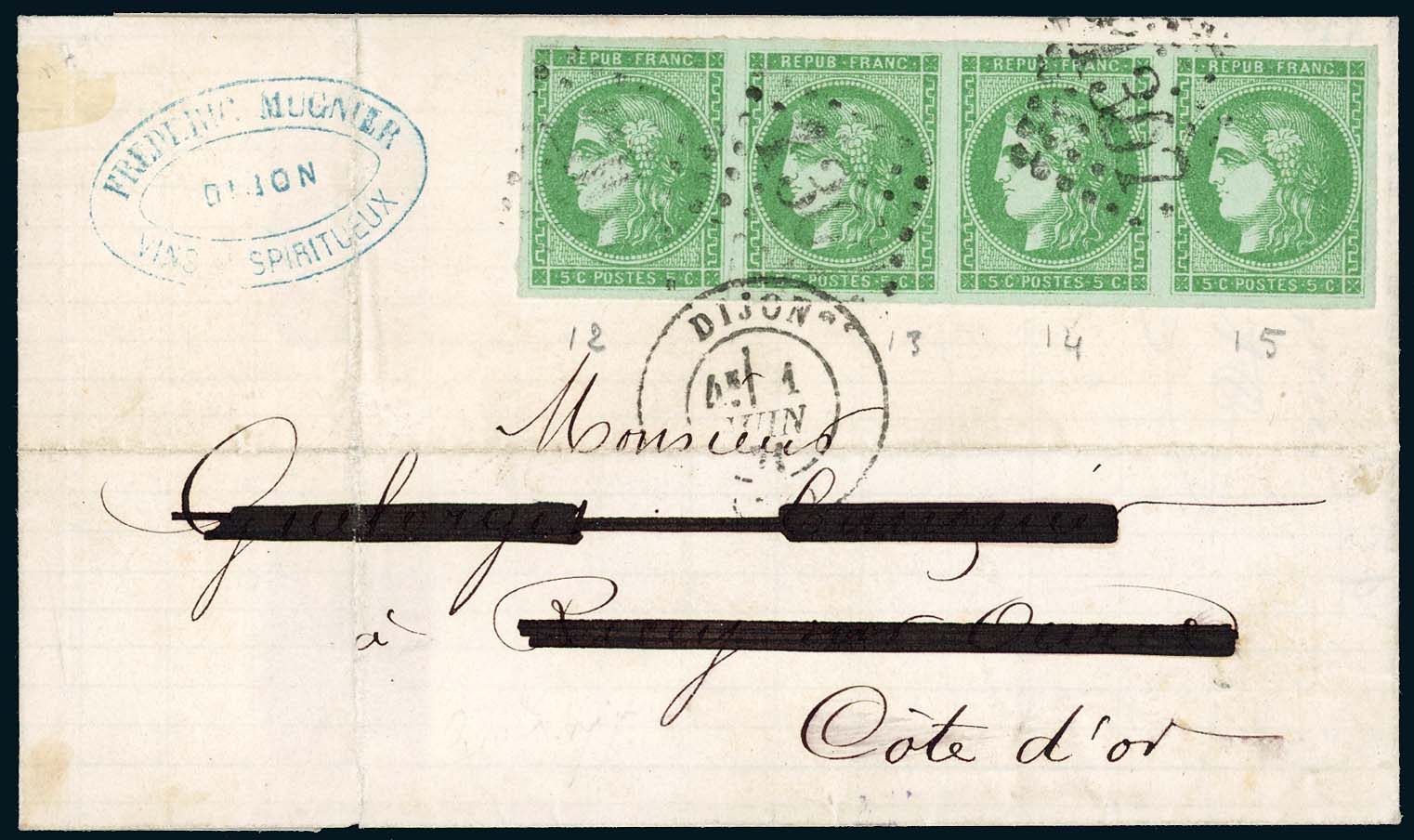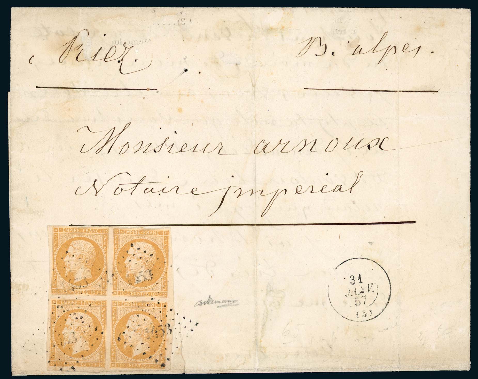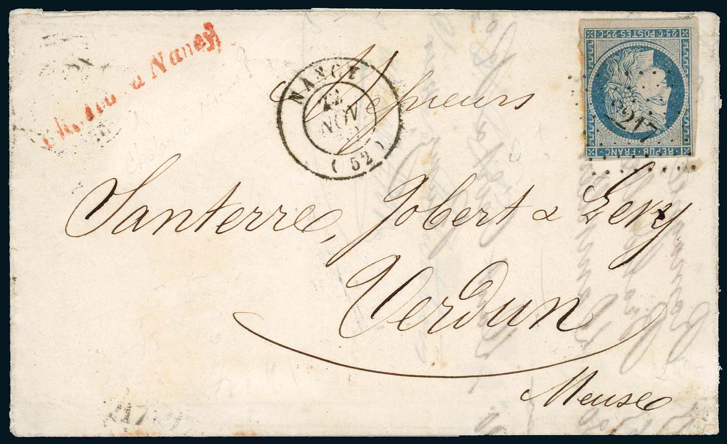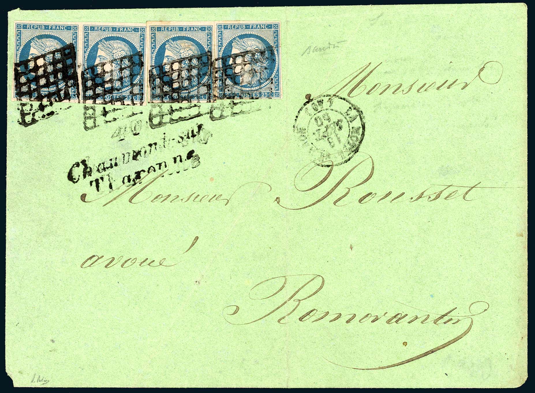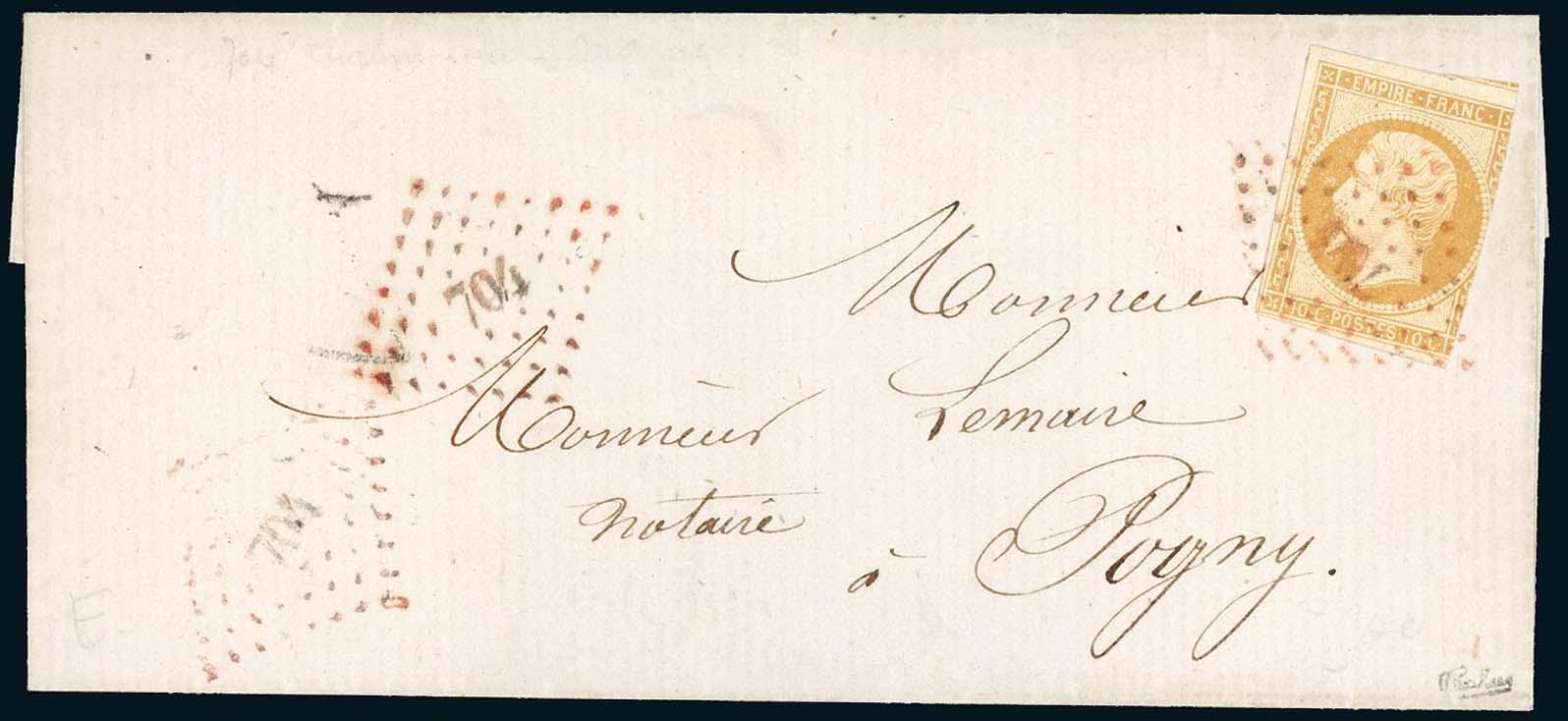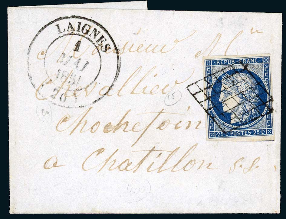 95 | N°4 OB grille, C. LAIGNES (tpe 13) sur lettre pour Chatillon 1851 TB | 25 | 50 | 25 | enchérir | |