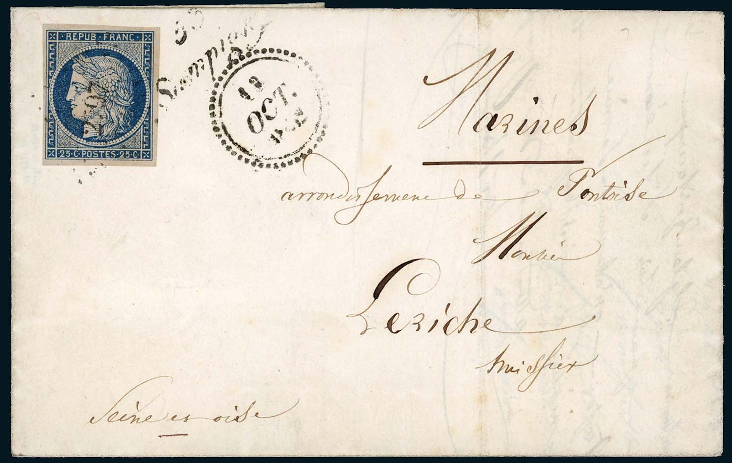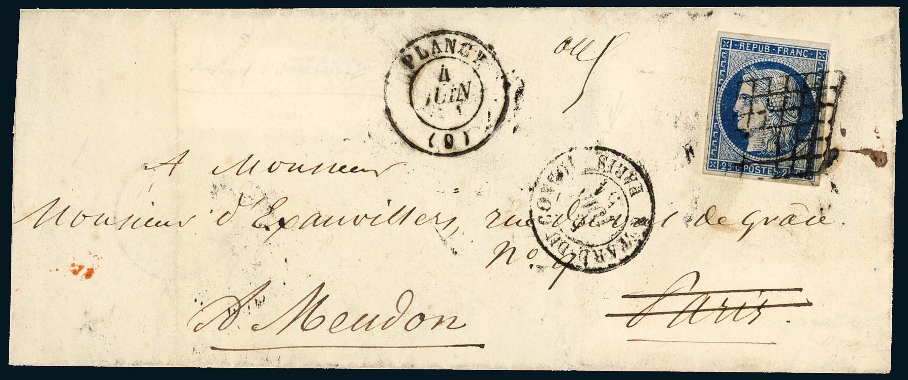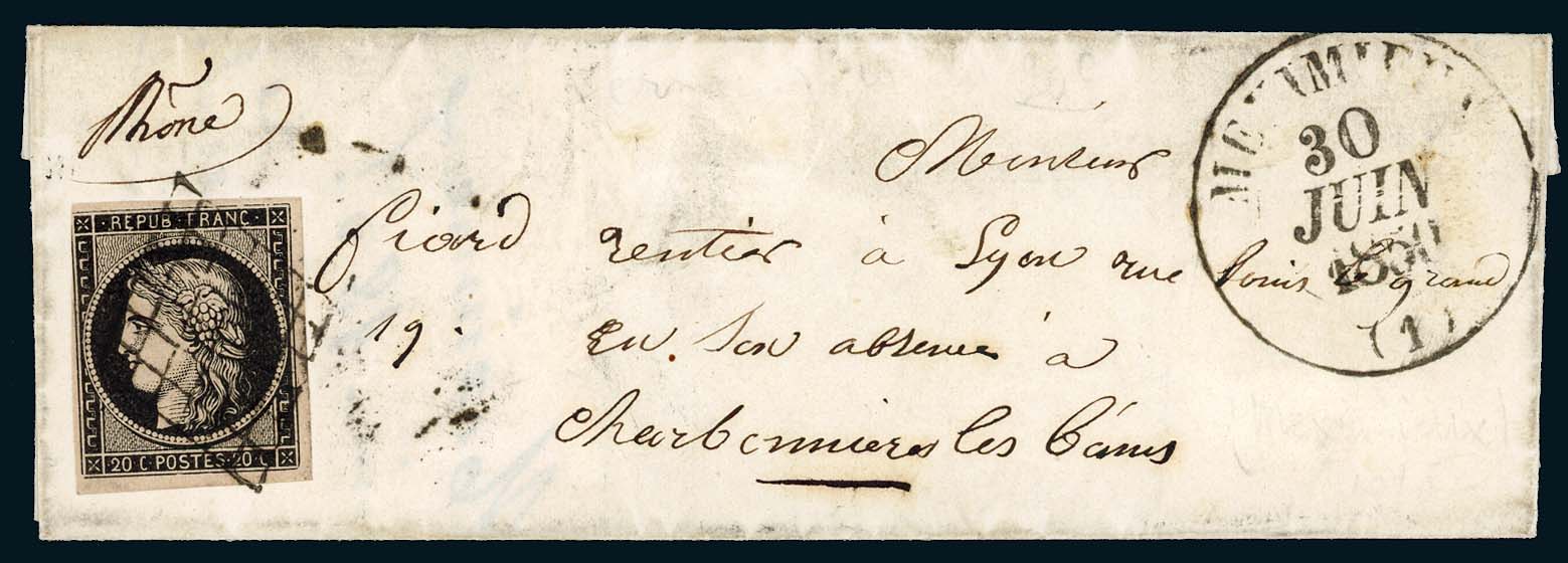 58 | N°3 (1 angle effleuré) OB grille, C. MEXIMIEUX (type 13) sur lettre au dernier jour du tarif pour Charbonnières 30 juin 1850 B/TB | 100 | 200 | 100 | enchérir | |