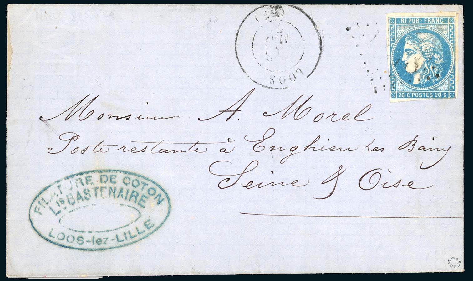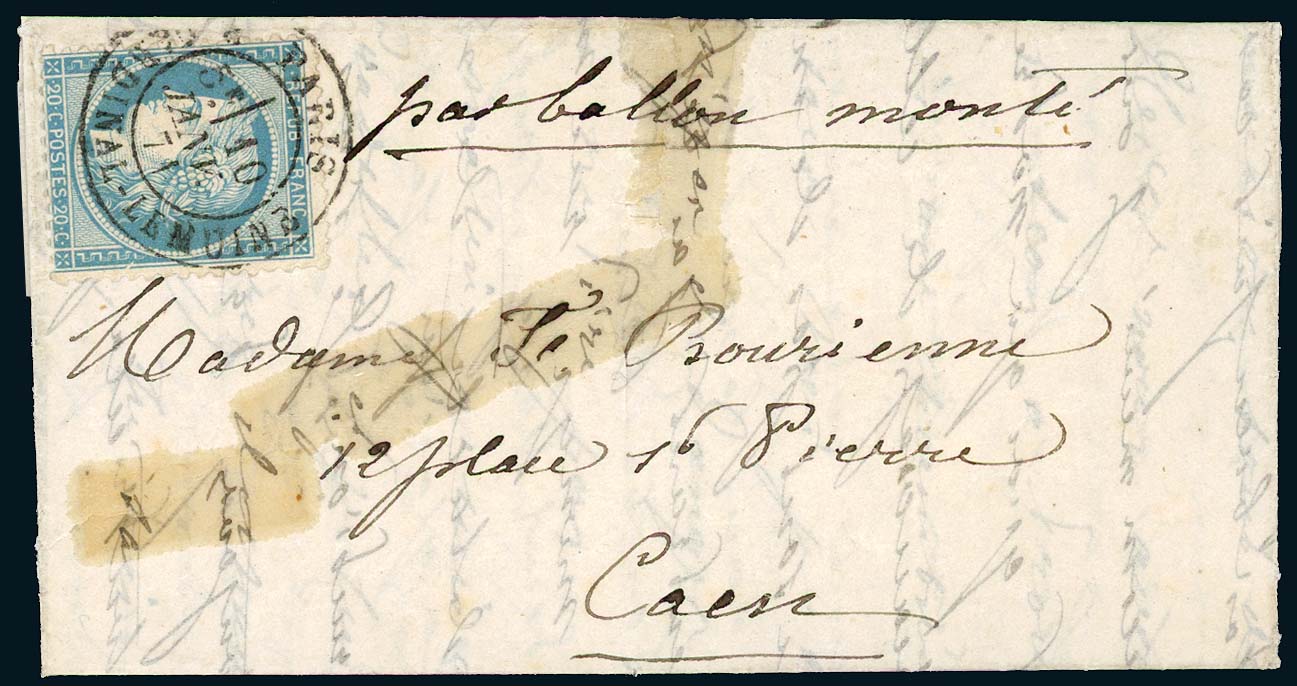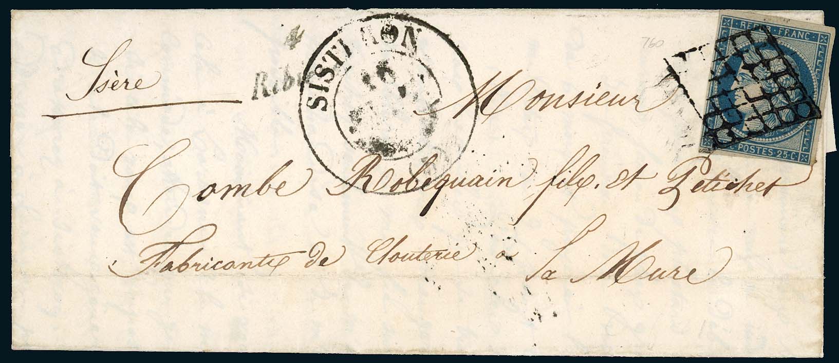 58 | N°3 (1 angle effleuré) OB grille, C. MEXIMIEUX (type 13) sur lettre au dernier jour du tarif pour Charbonnières 30 juin 1850 B/TB | 100 | 200 | 100 | enchérir | |
