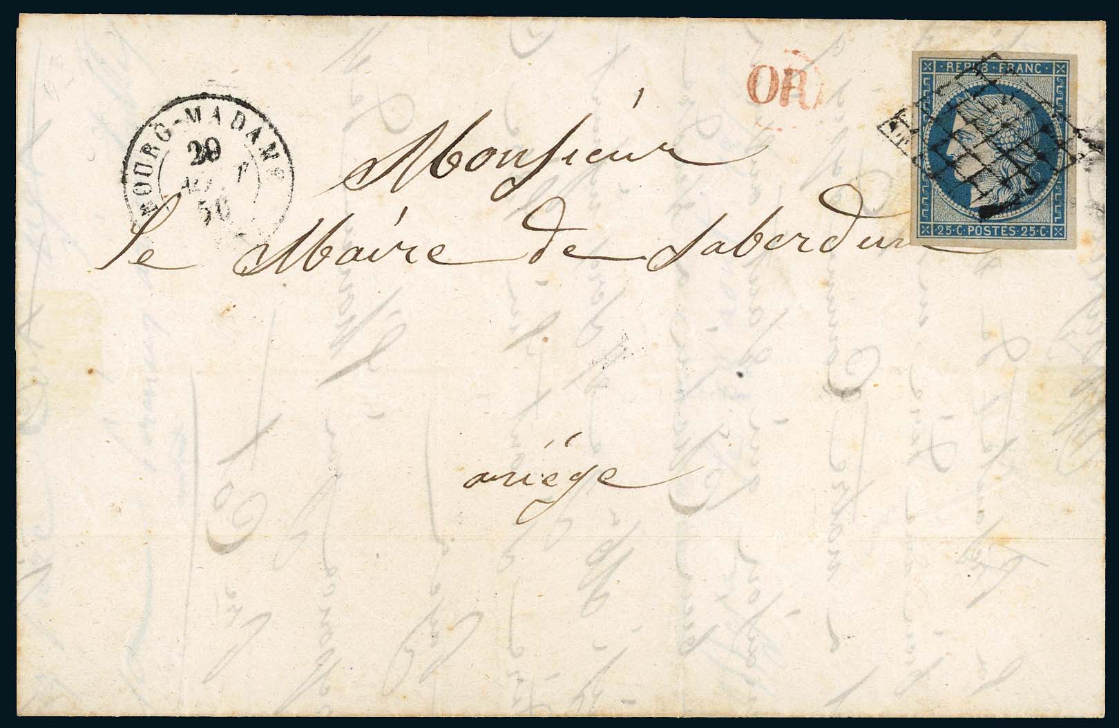 56 | N°3 OB grille, C. SAVERDUN sur lettre pour Pamiers, jolie nuance proche du chamoix, signé Brun 1849 TB | 60 | 120 | 60 | enchérir | |