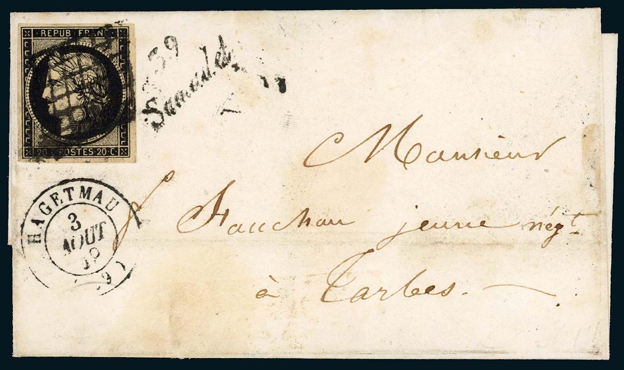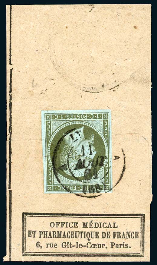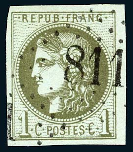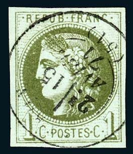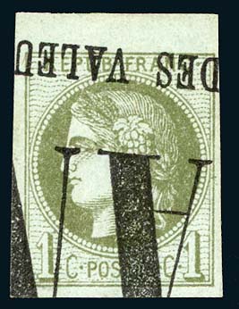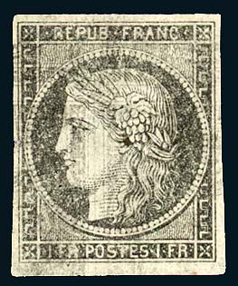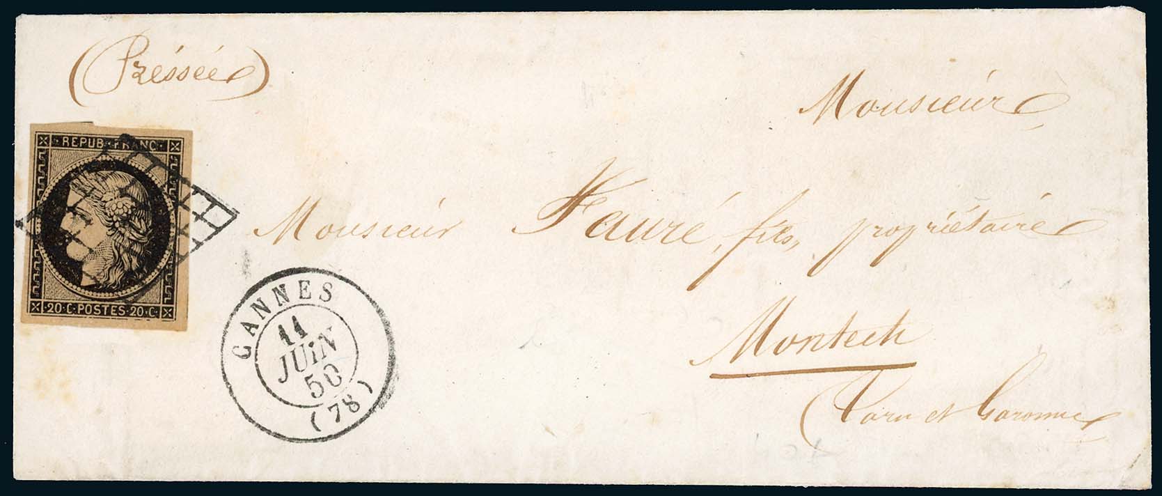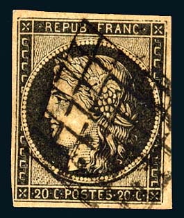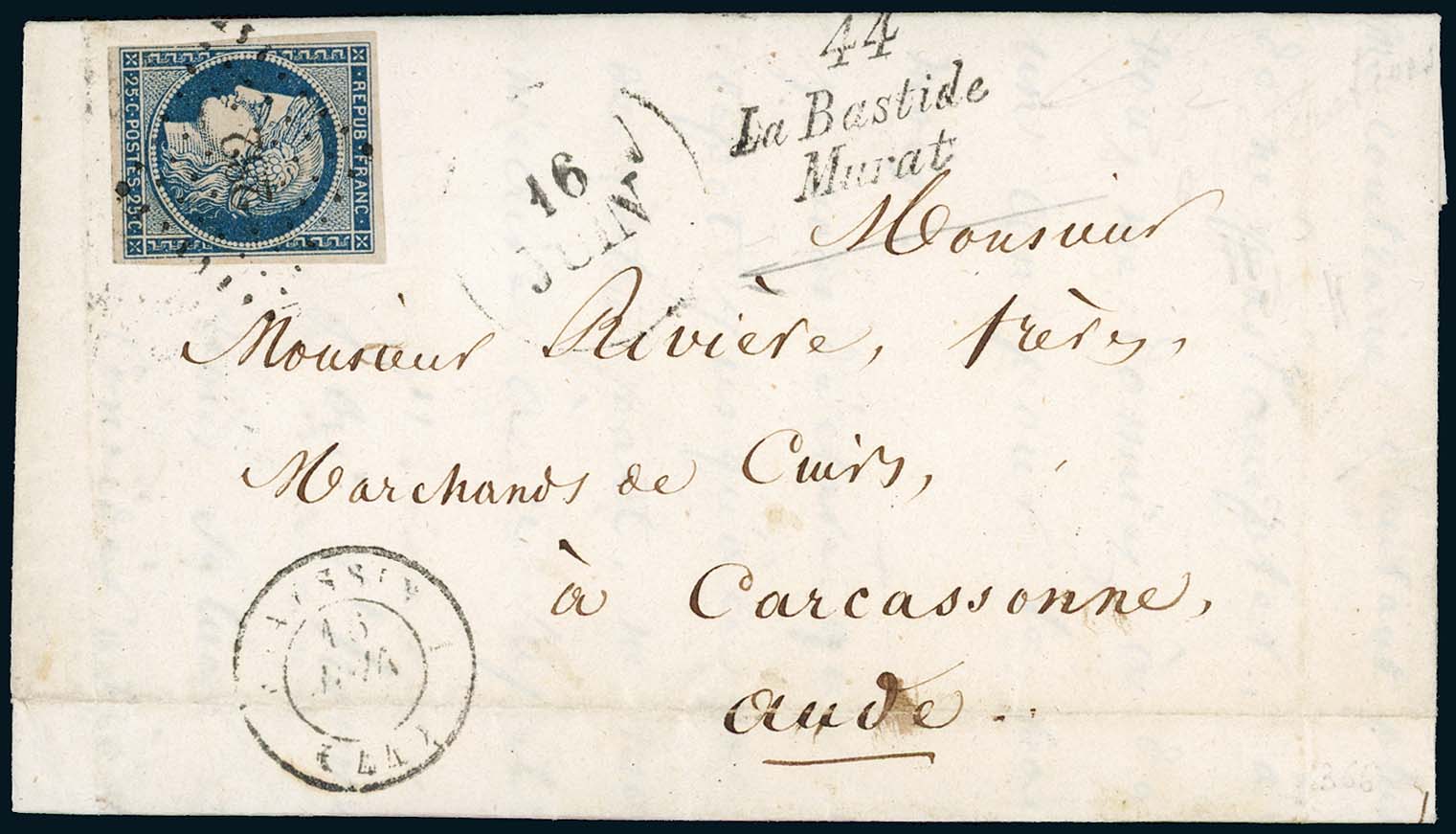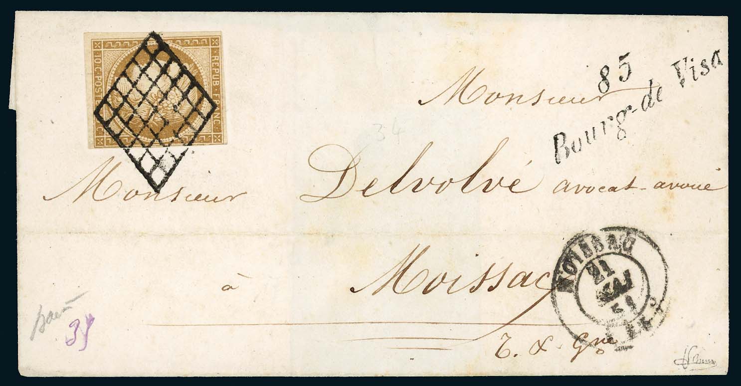 20 | N°1b (bistre verdâtre, filet effleuré) OB grille, cursive 85/Bourg-de-Visa et C. MOISSAC en arrivée au recto, rare, signatures dont Brun 1851 Superbe | 100 | 200 | 100 | enchérir | |
