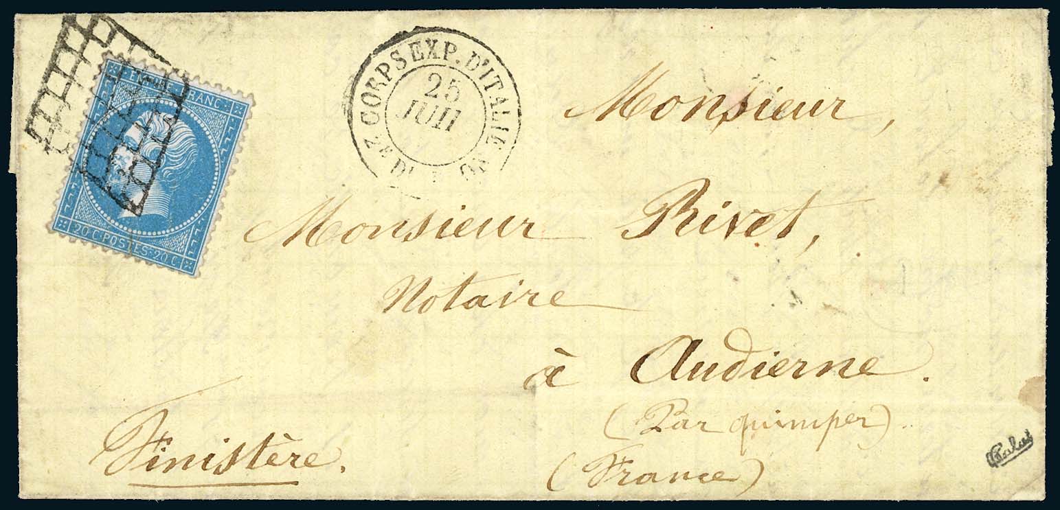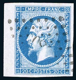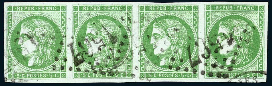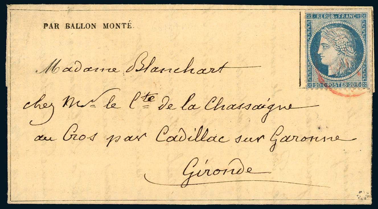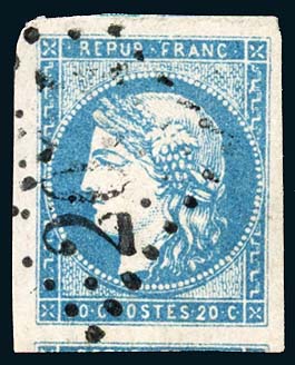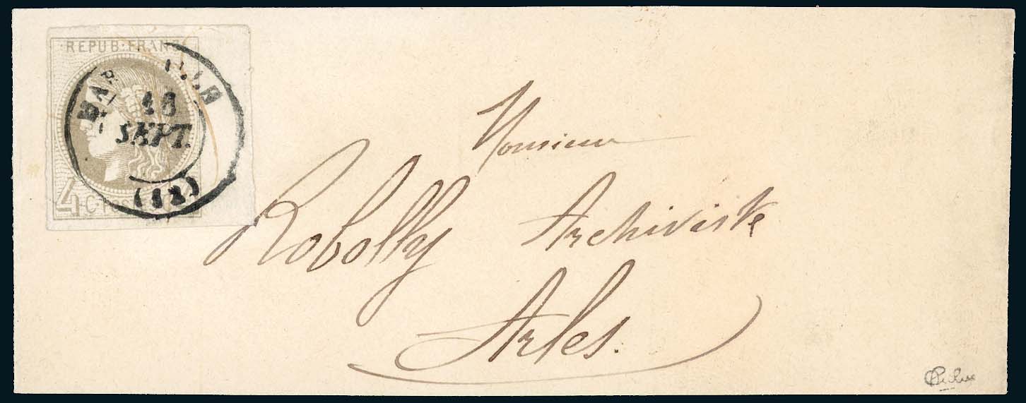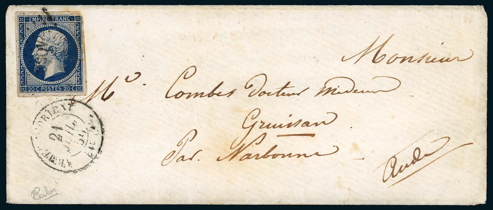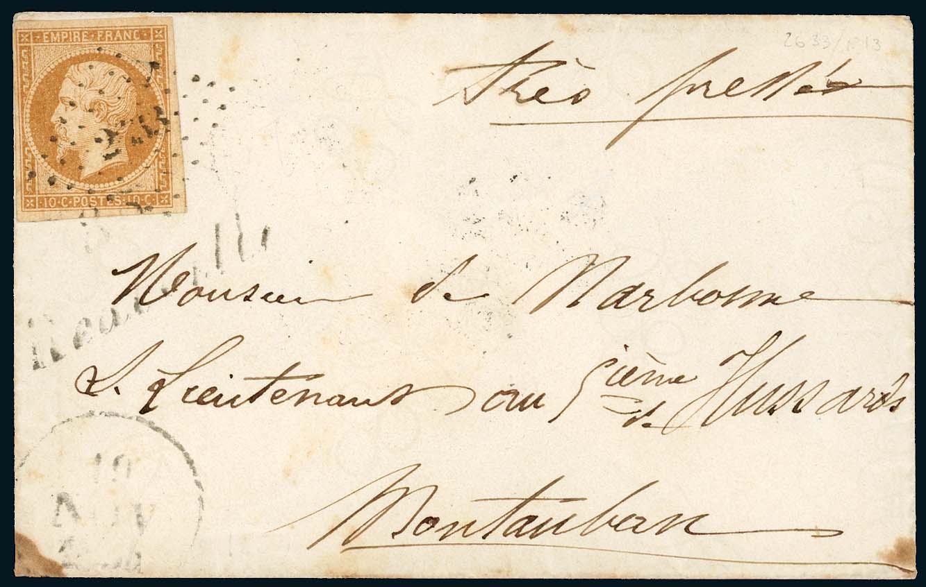 20 | N°1b (bistre verdâtre, filet effleuré) OB grille, cursive 85/Bourg-de-Visa et C. MOISSAC en arrivée au recto, rare, signatures dont Brun 1851 Superbe | 100 | 200 | 100 | enchérir | |