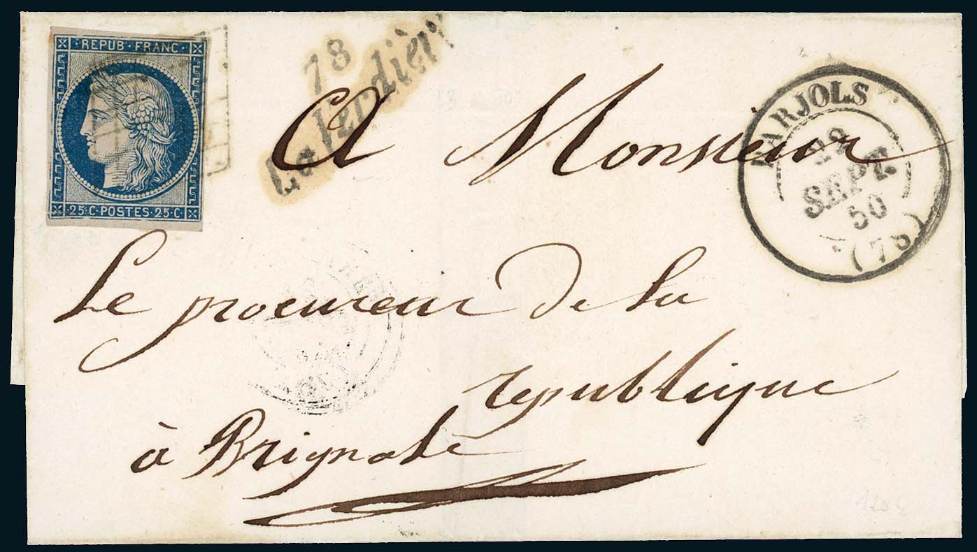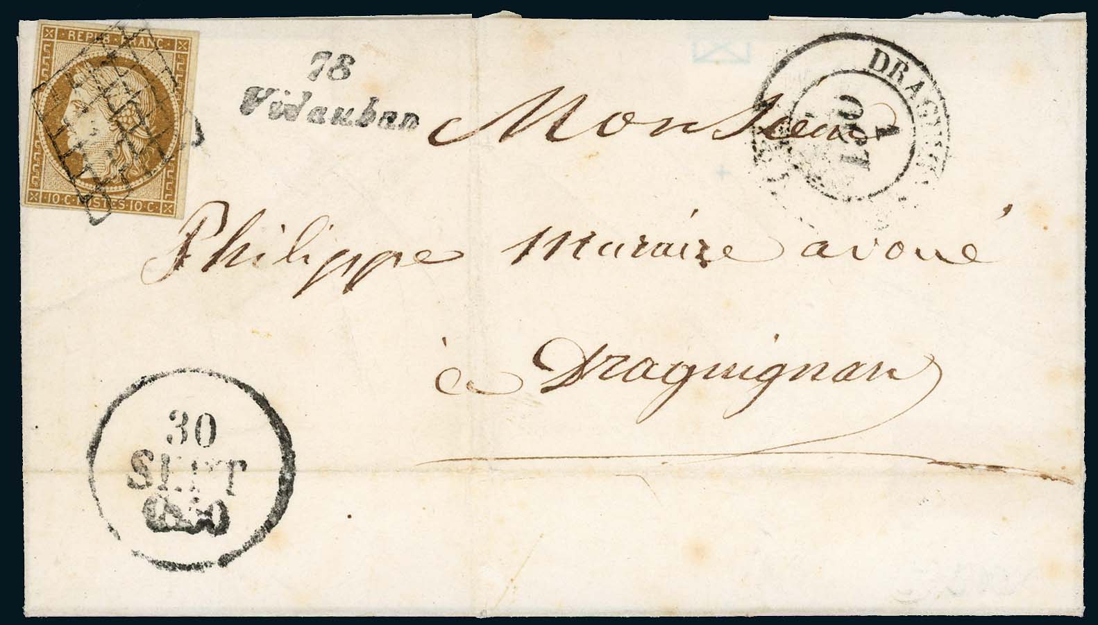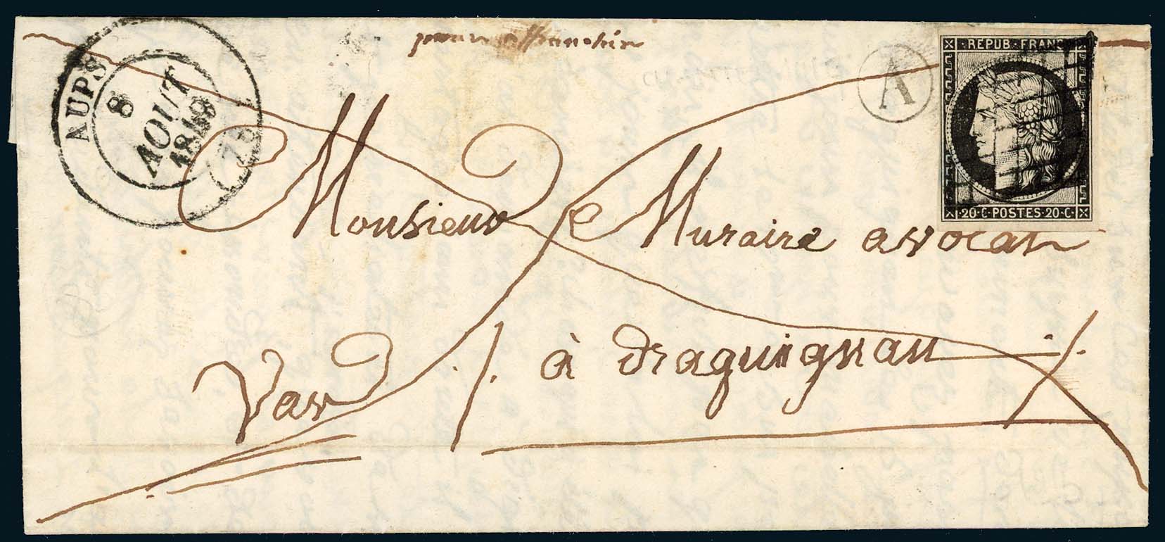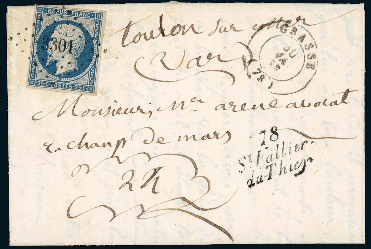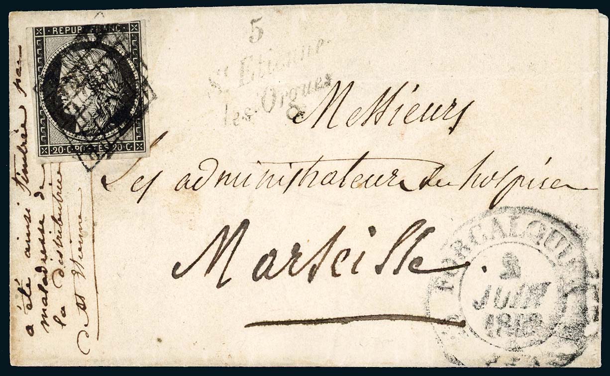 71 | N°3 (défectueux) OB grille, C. FORCALQUIER (type 12) et cursive 5/St Etienne/les-Orgues sur lettre pour Marseille avec C. MARSEILLE en arrivée 1849 Combinaison rare B/TB | 50 | 100 | 50 | enchérir | |