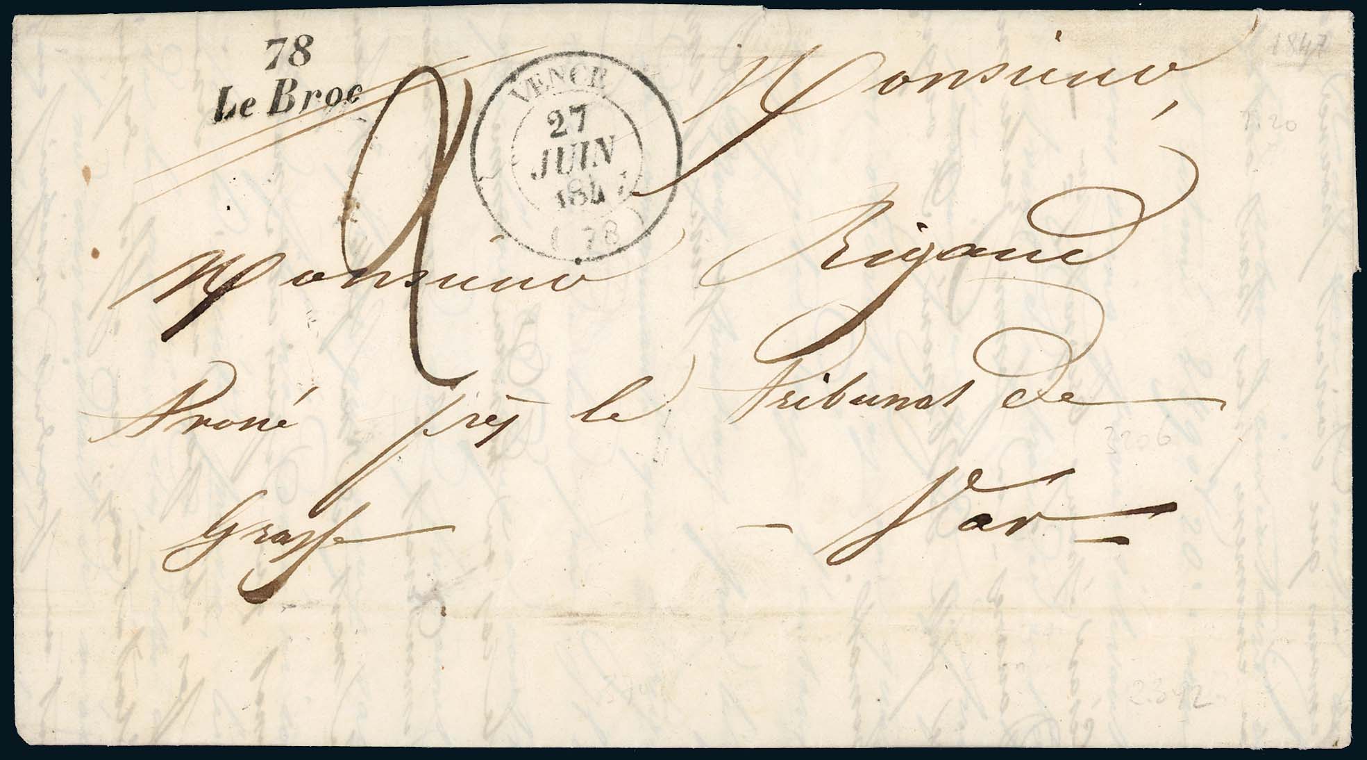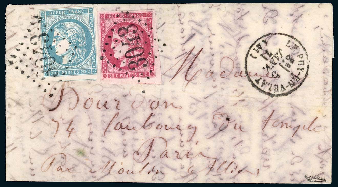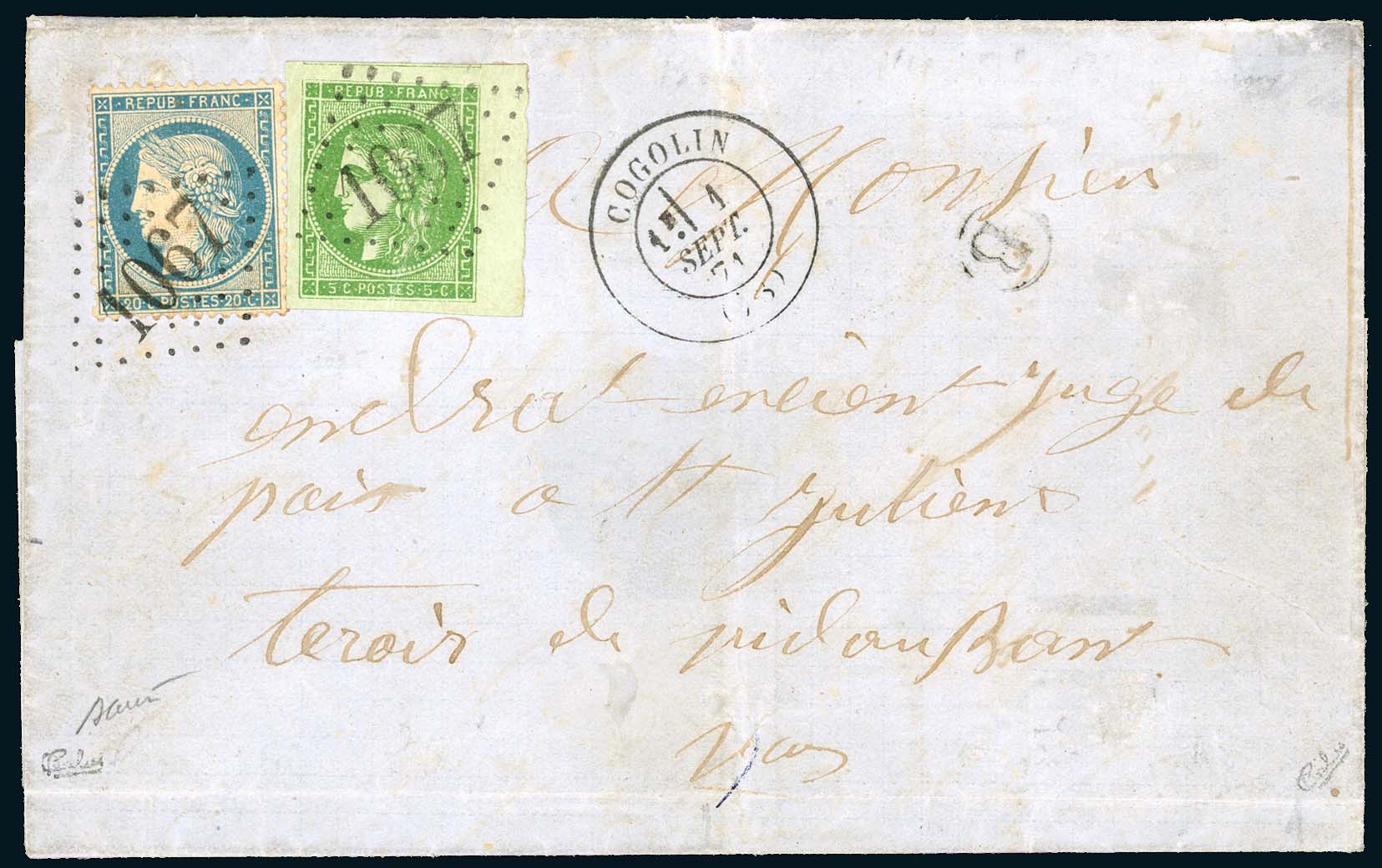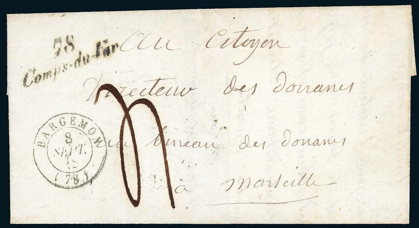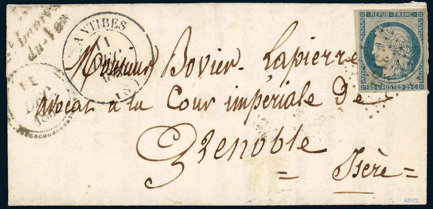 71 | N°3 (défectueux) OB grille, C. FORCALQUIER (type 12) et cursive 5/St Etienne/les-Orgues sur lettre pour Marseille avec C. MARSEILLE en arrivée 1849 Combinaison rare B/TB | 50 | 100 | 50 | enchérir | |