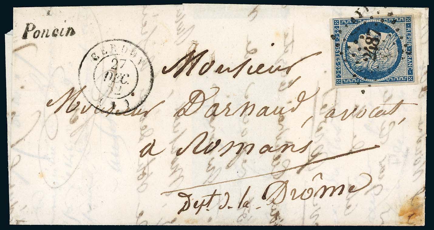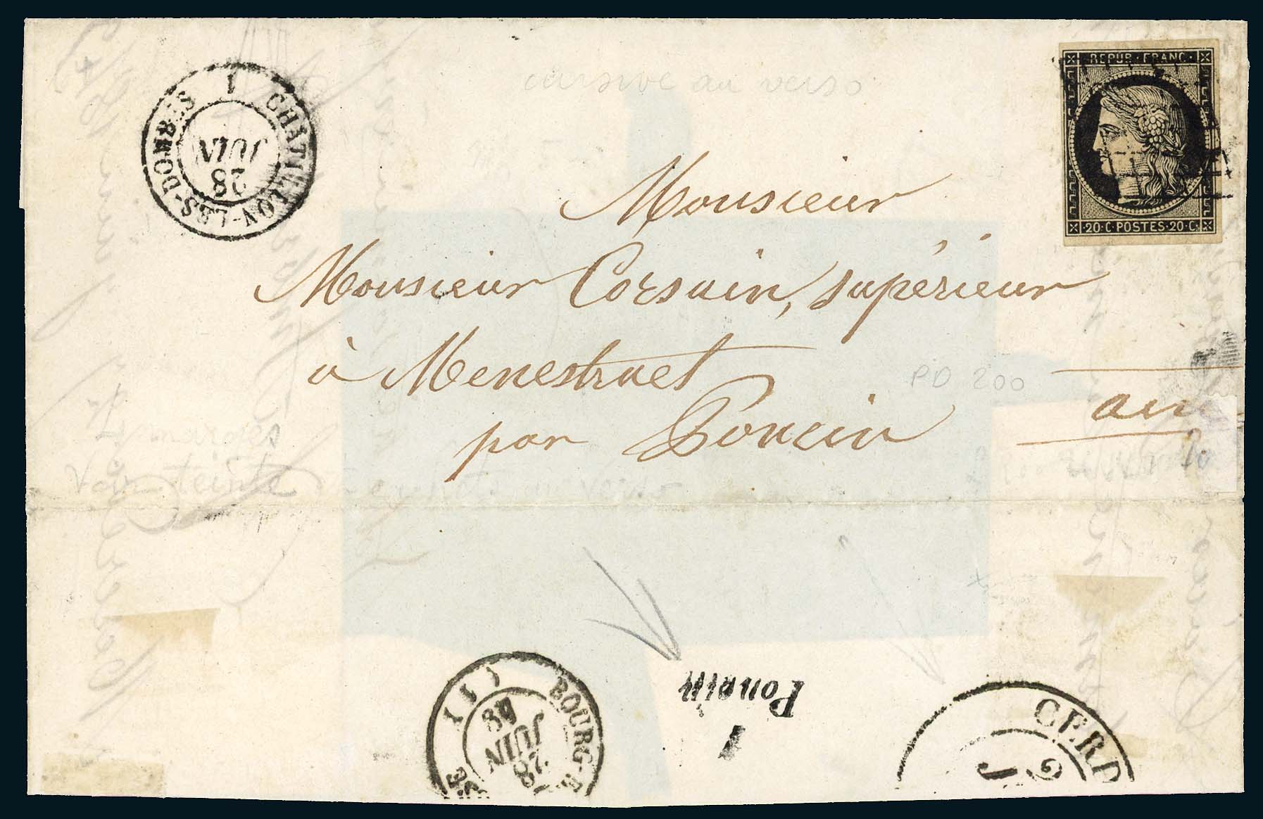 70 | N°3 OB grille, C. CHATILLON-LES-DOMBES sur lettre pour Poncin avec en arrivée la cursive 1849 TB | 30 | 60 | 30 | enchérir | |