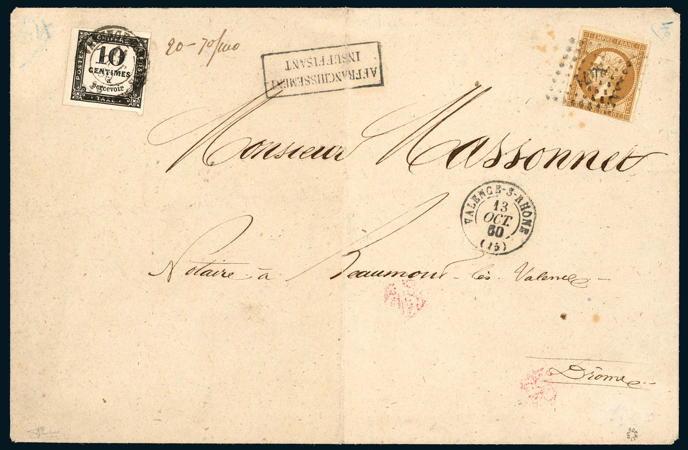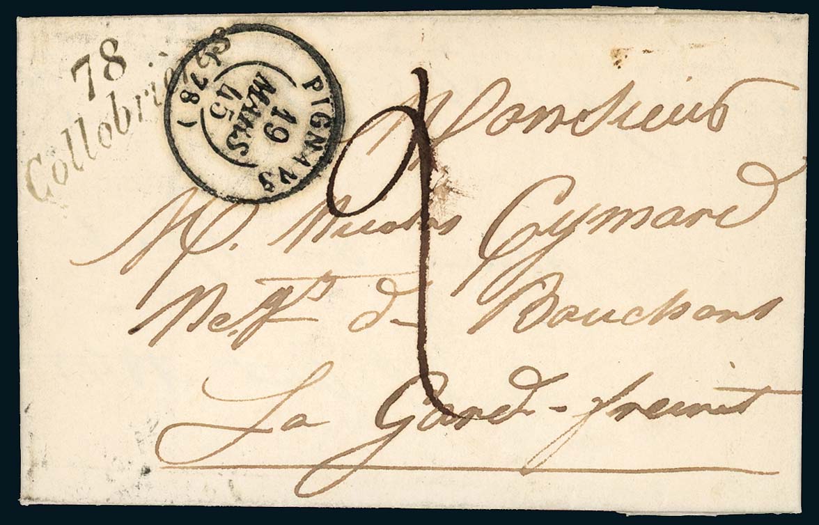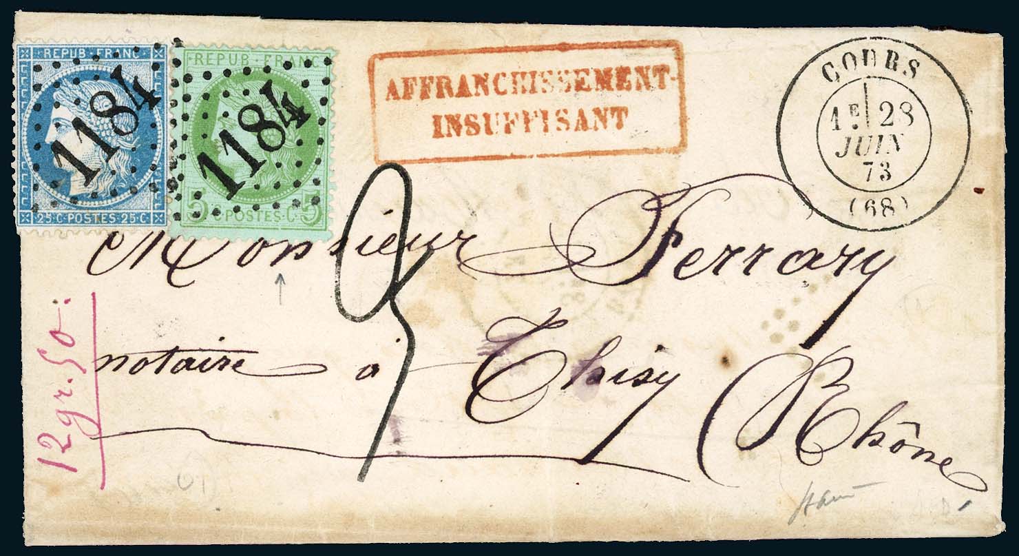 17 | N°1a, bistre-brun OB PC 1327 et taxe double trait 25, C. FOURS (56) sur lettre pour Saint-Hilaire (sous Charlieu), oblitération exceptionnelle le tarif local ayant été refusé (distance 50km), signatures dont Calves 1852 TB | 500 | 800 | 500 | enchérir | |