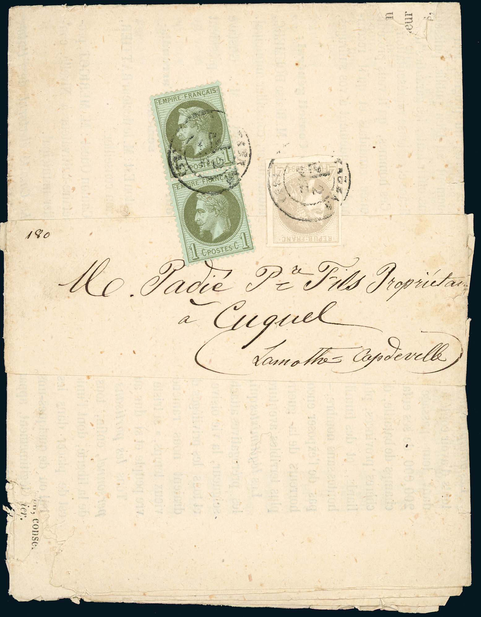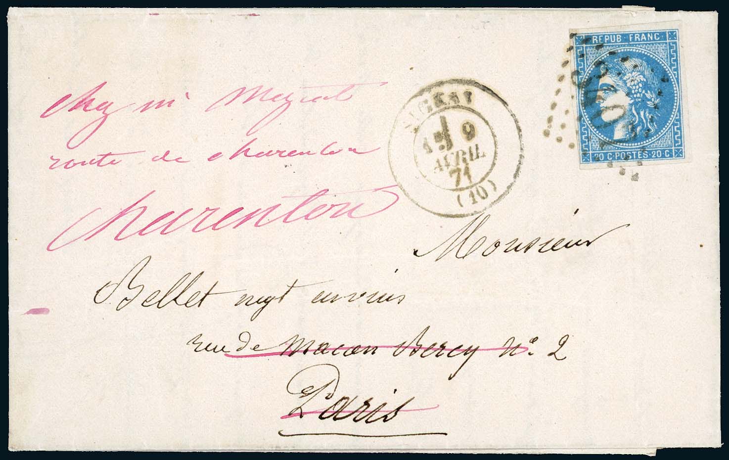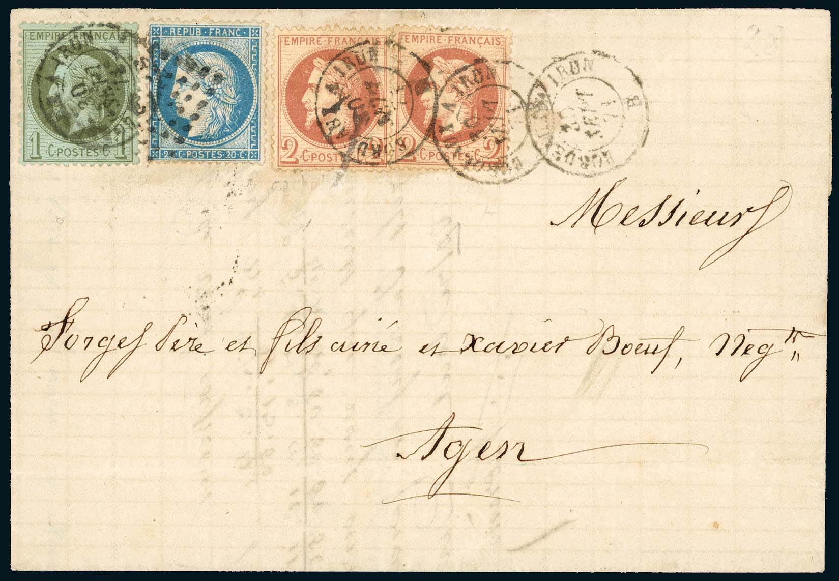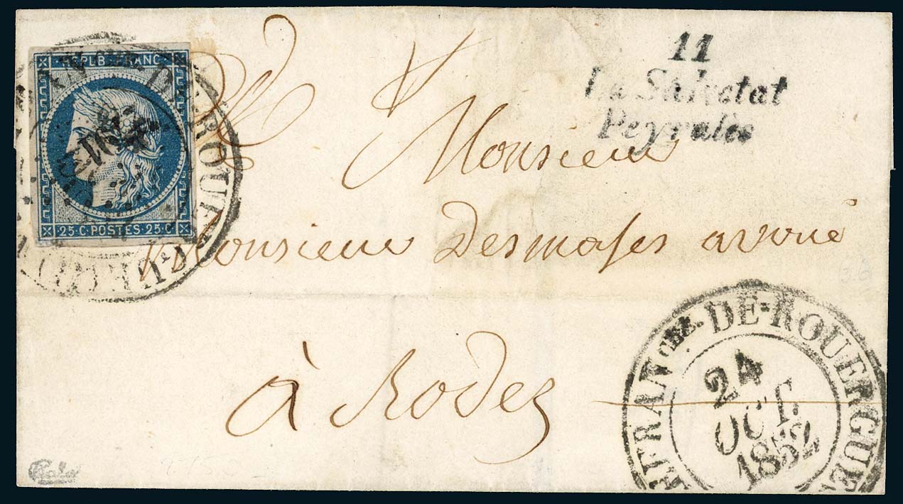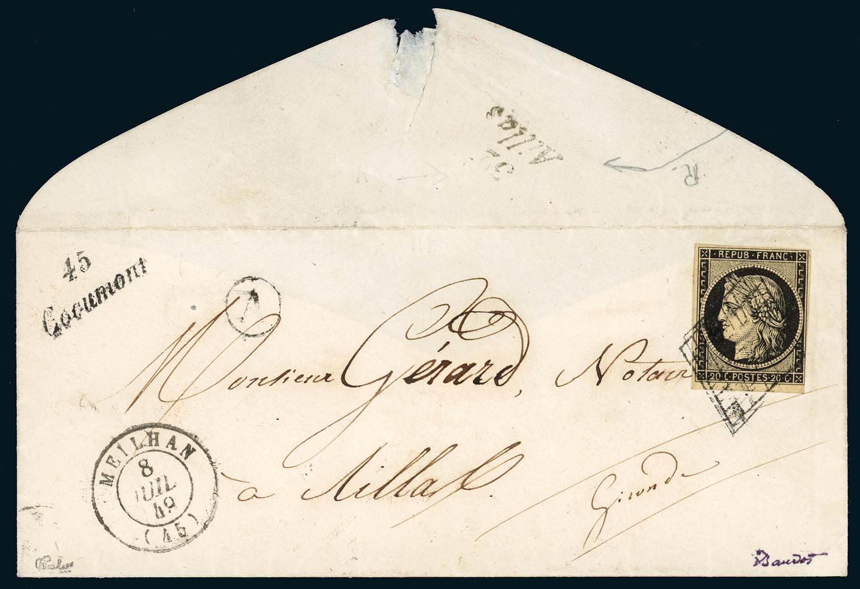 79 | N°3 OB grille, C. MEILHAN, cursive 45/Cocumont et boite rurale A sur enveloppe pour Aillas avec cursive 32/Aillas en arrivée au verso 1849 Combinaison rare TB | 100 | 200 | 100 | enchérir | |