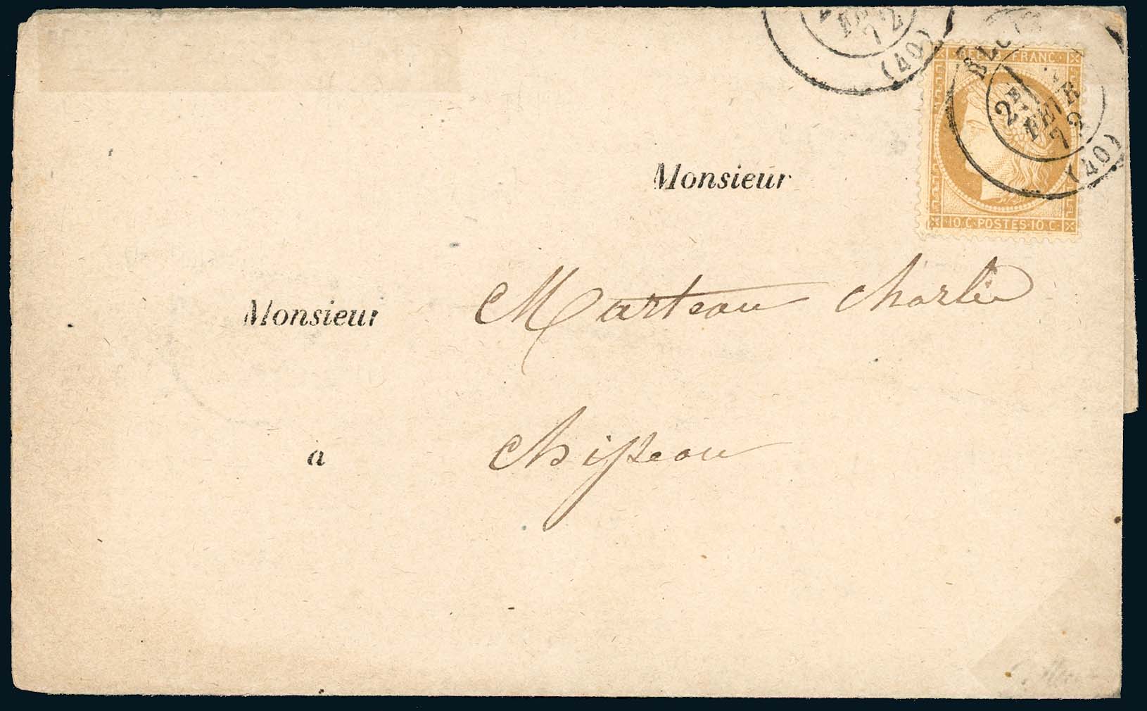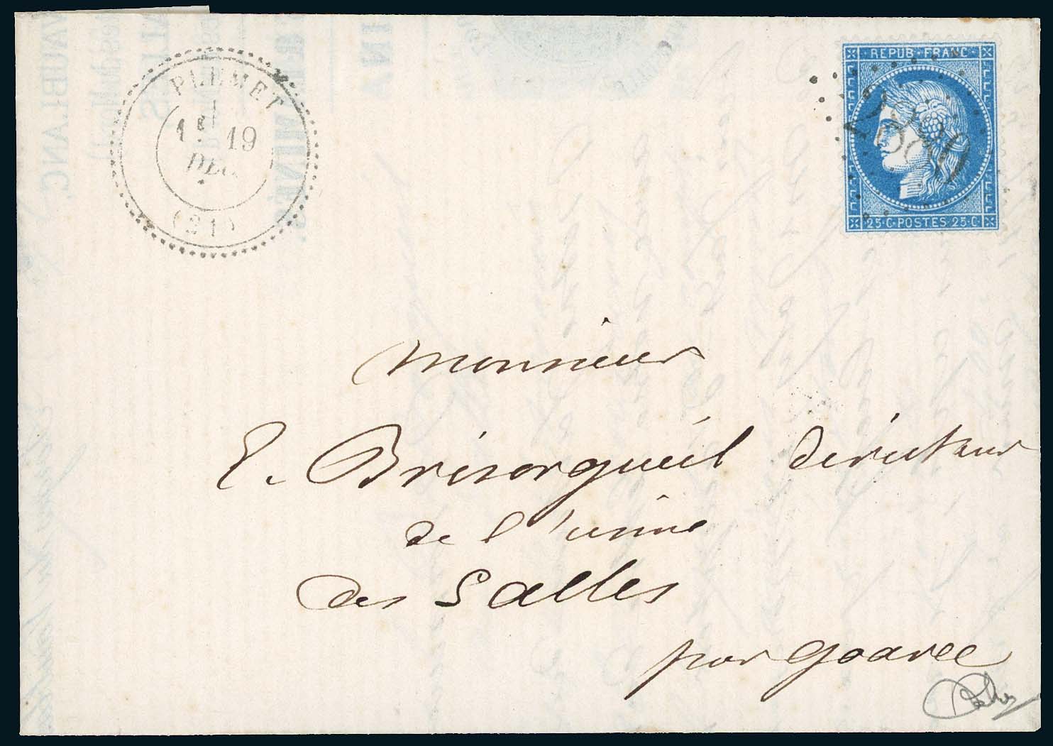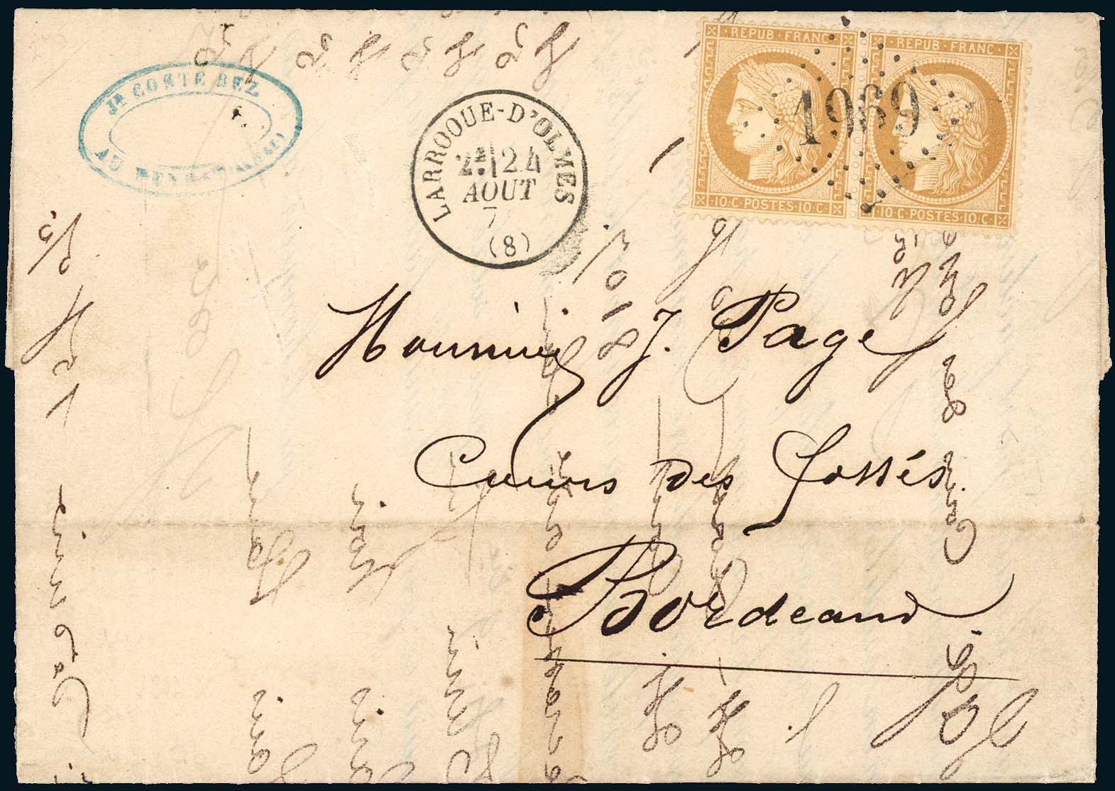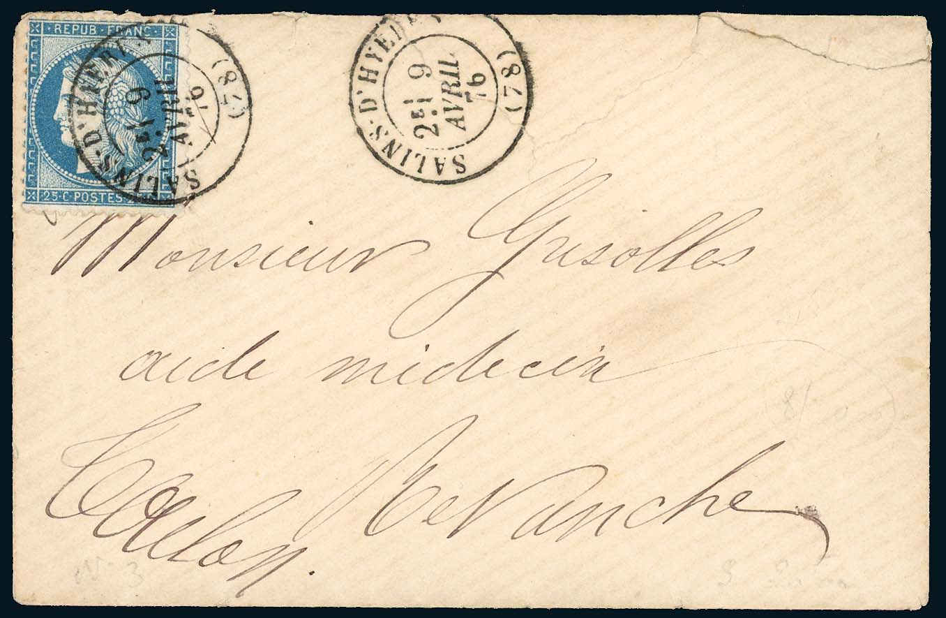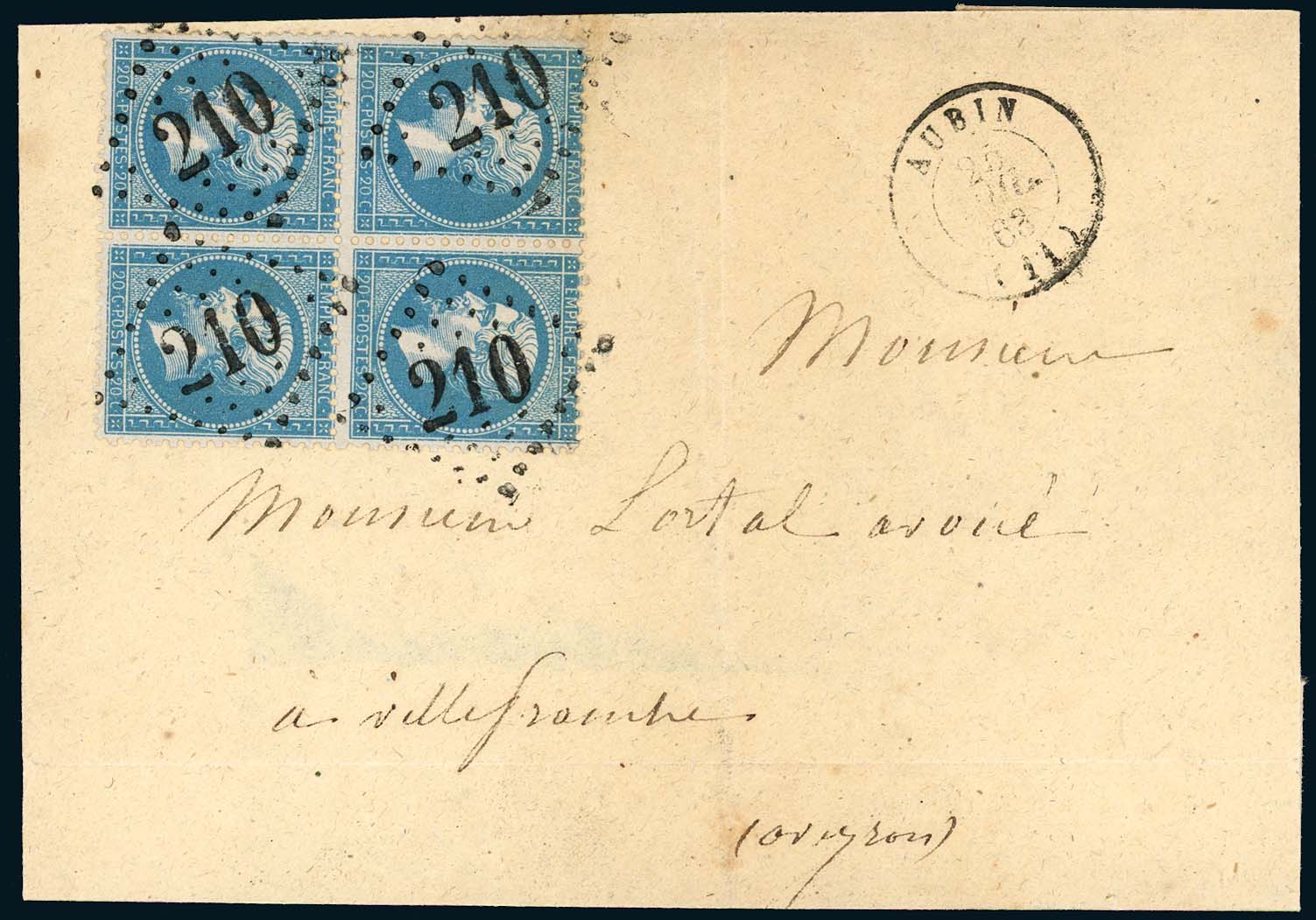 79 | N°3 OB grille, C. MEILHAN, cursive 45/Cocumont et boite rurale A sur enveloppe pour Aillas avec cursive 32/Aillas en arrivée au verso 1849 Combinaison rare TB | 100 | 200 | 100 | enchérir | |