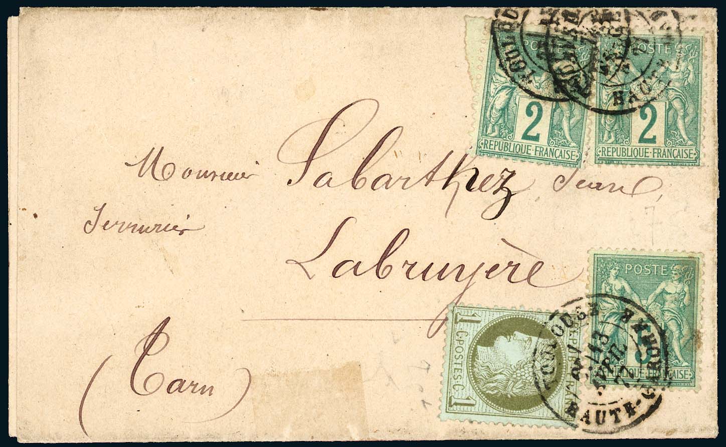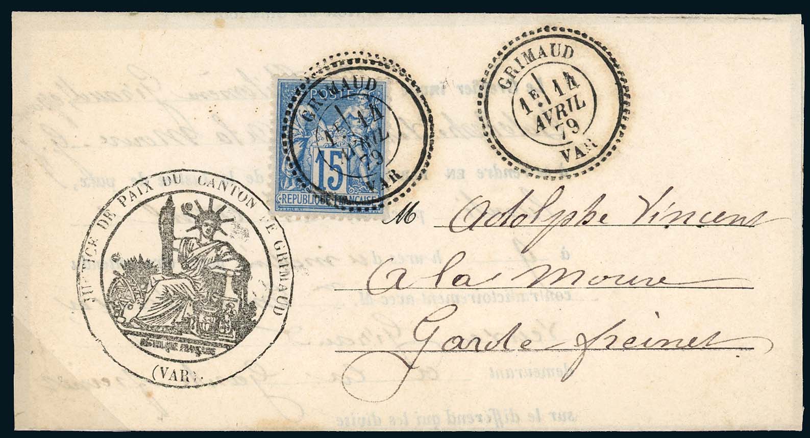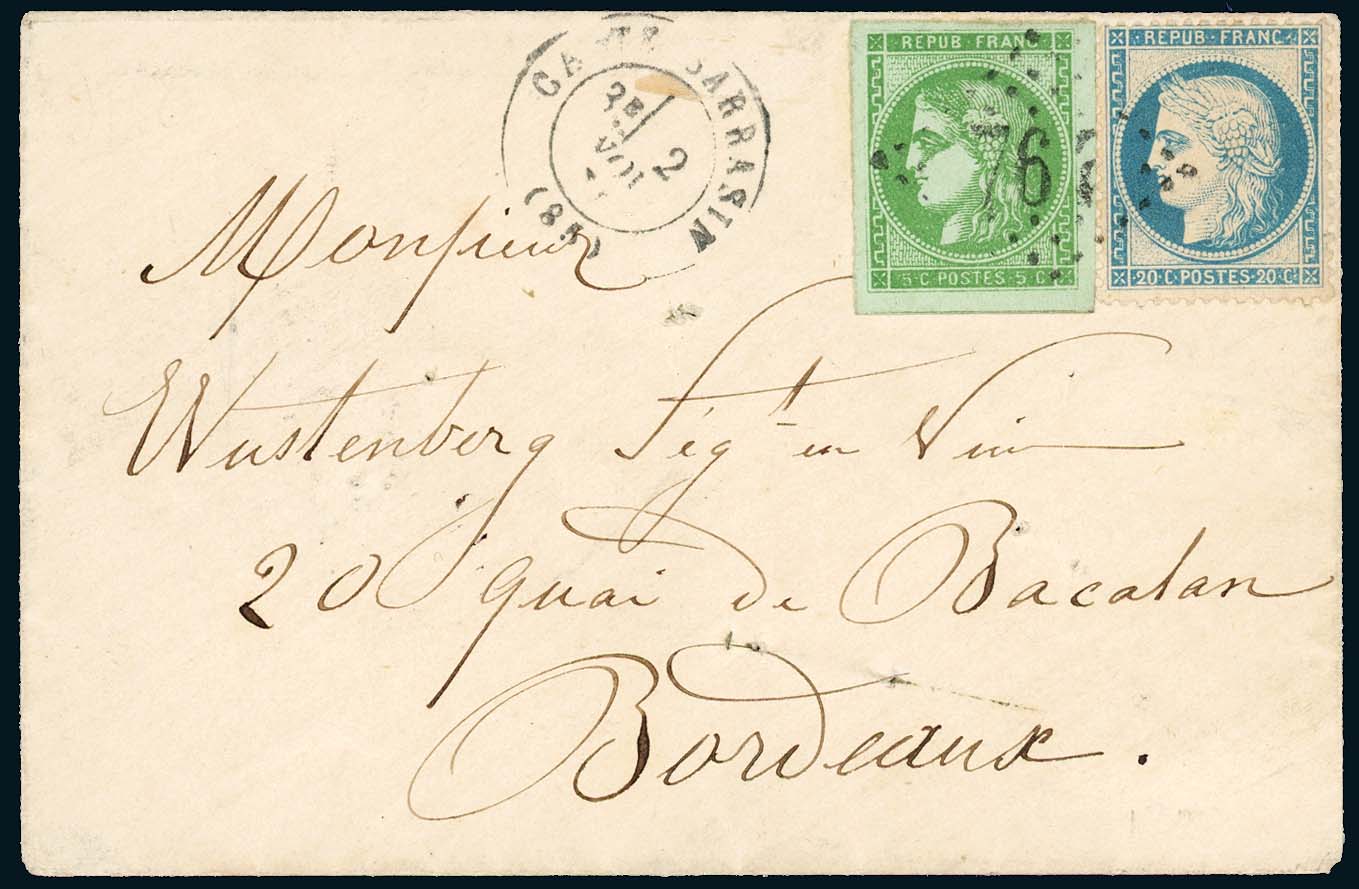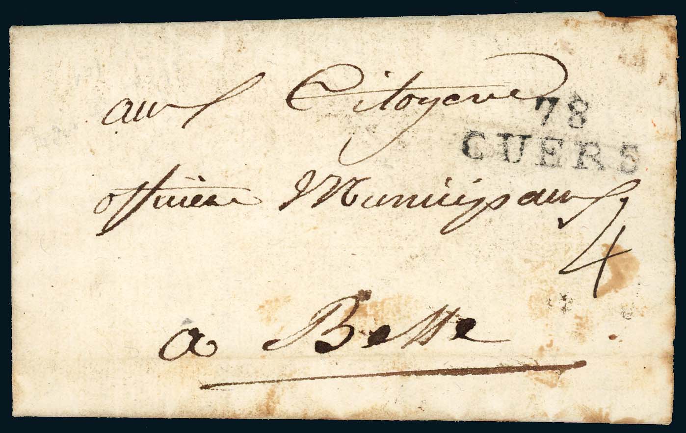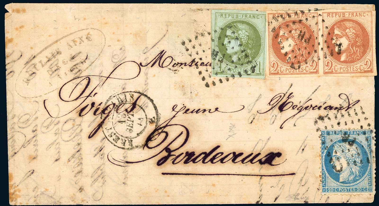 79 | N°3 OB grille, C. MEILHAN, cursive 45/Cocumont et boite rurale A sur enveloppe pour Aillas avec cursive 32/Aillas en arrivée au verso 1849 Combinaison rare TB | 100 | 200 | 100 | enchérir | |