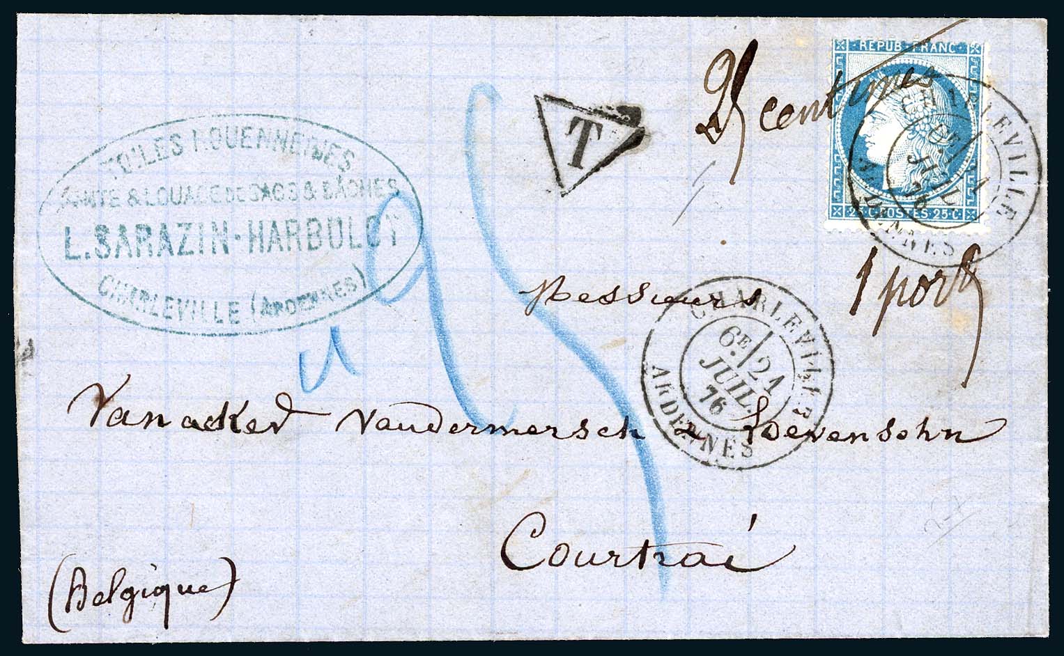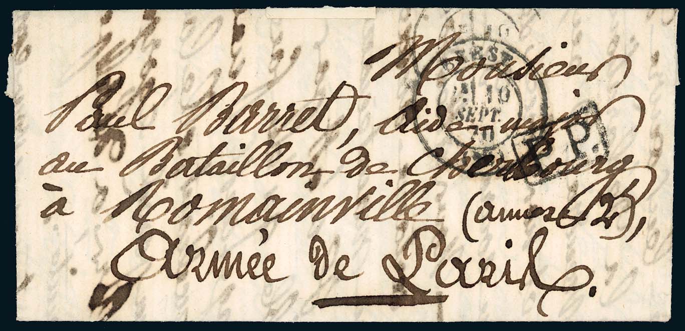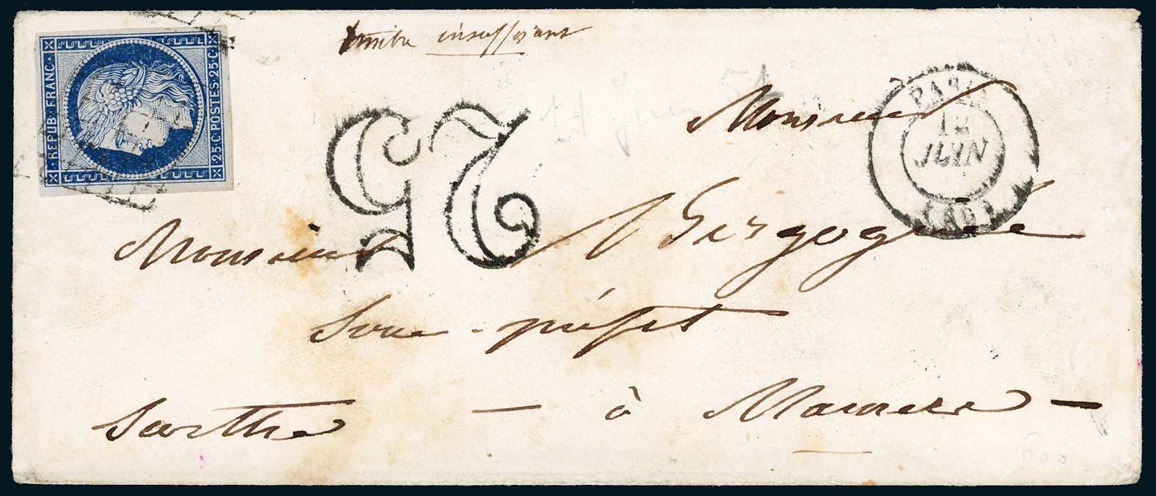 88 | N°3 OB grille, C. PARIS sur lettre pour Verdun taxée 2 à la plume, mention manuscrite du poids "7 3/4" 1849 TB | 50 | 100 | 50 | enchérir | |