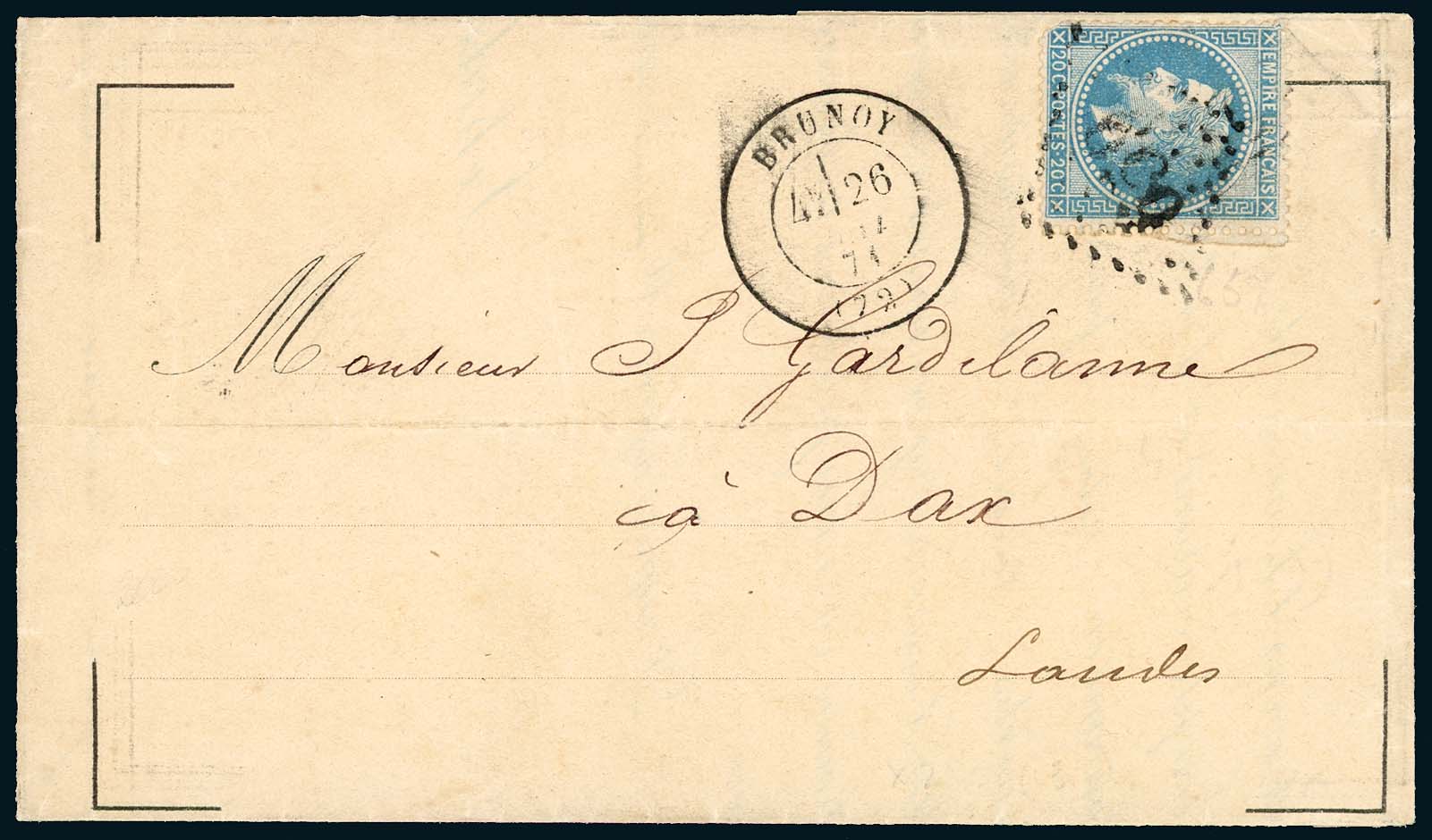 76 | N°3 OB grille, C. ST-SEINE (type 14) et cursive 20/Lamargelle sur lettre pour Dijon 1850 TB | 60 | 120 | 60 | enchérir | |