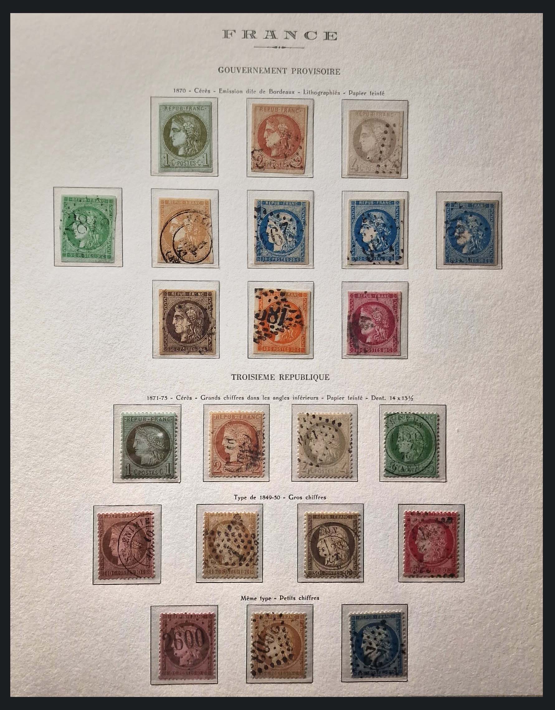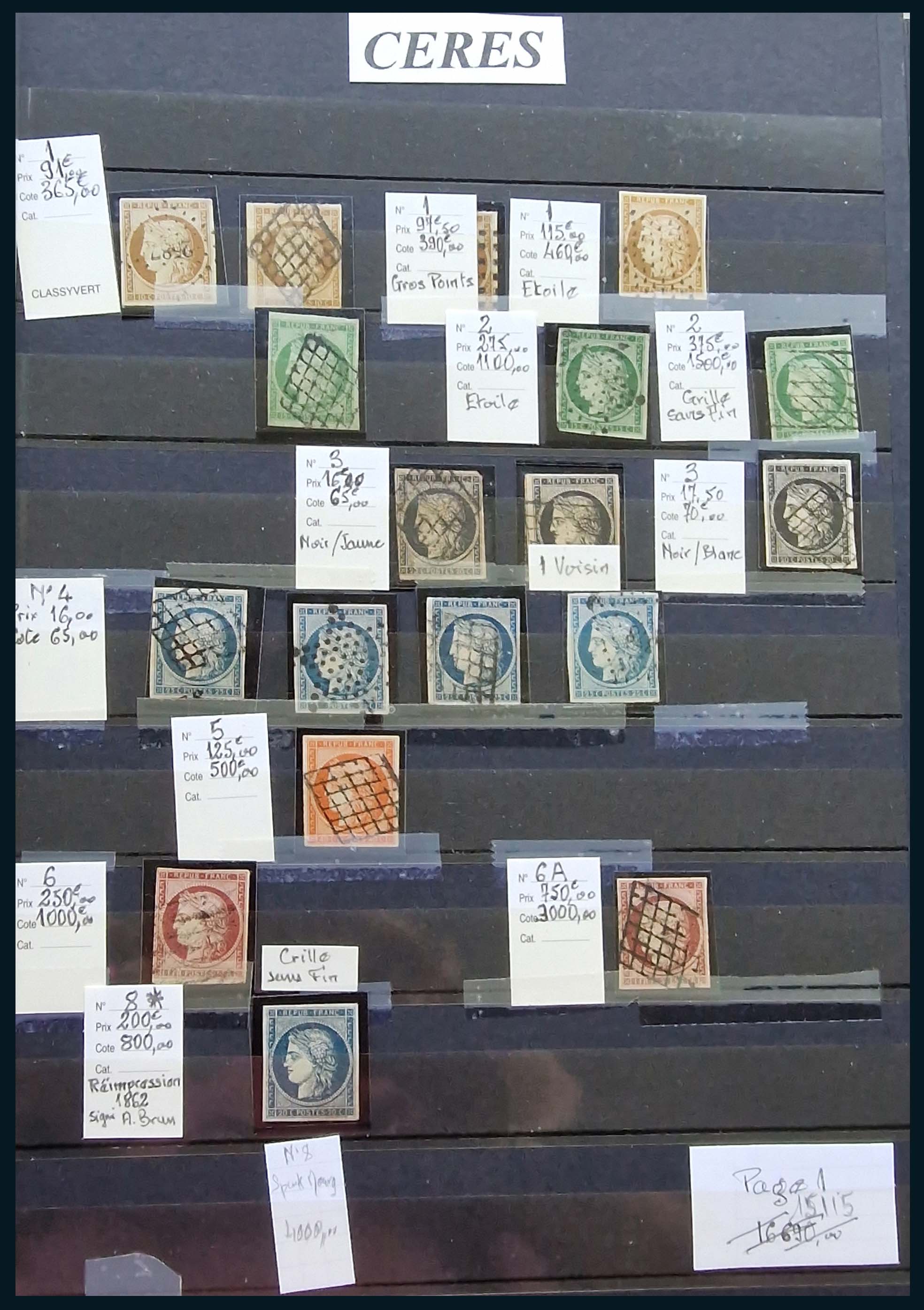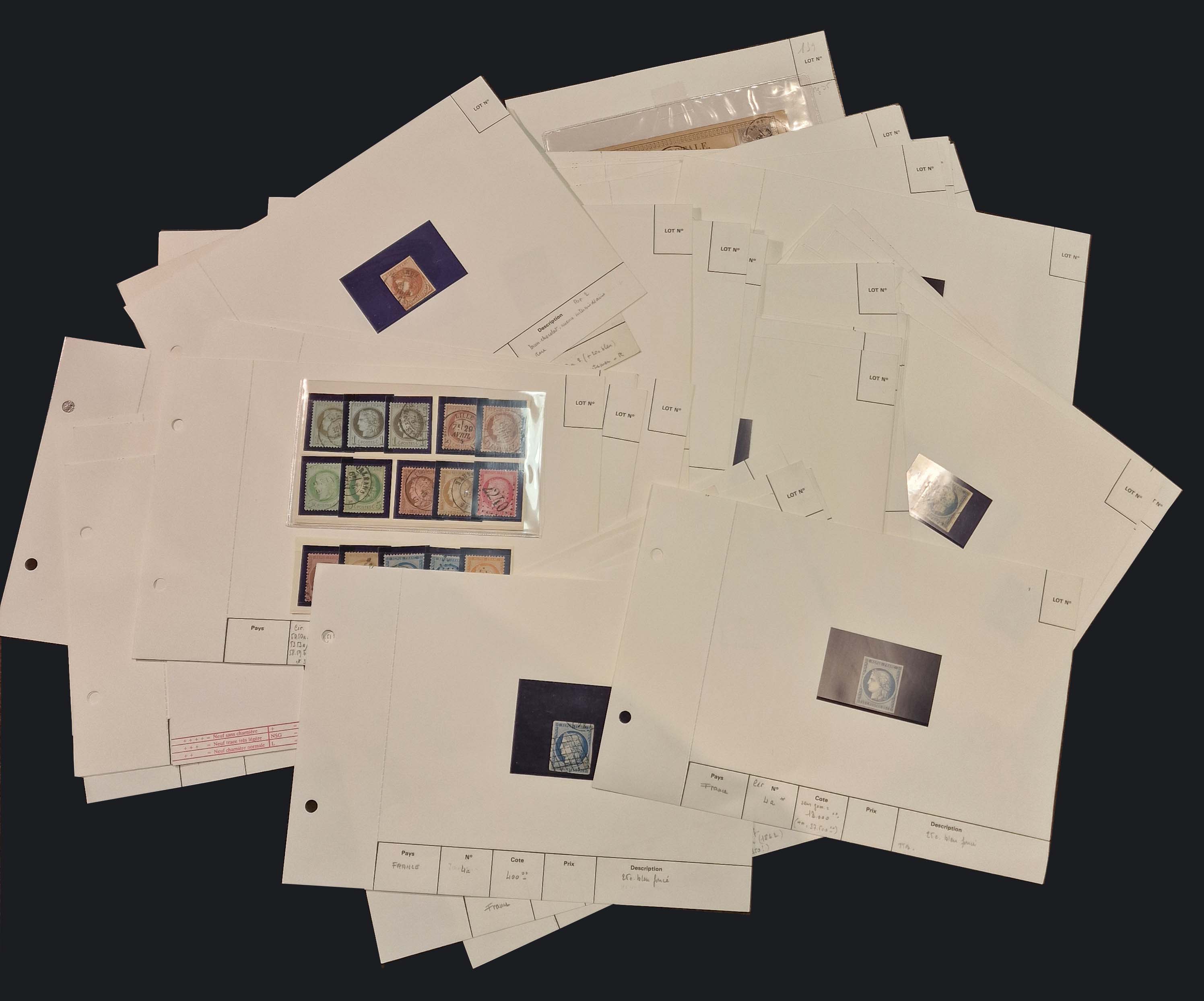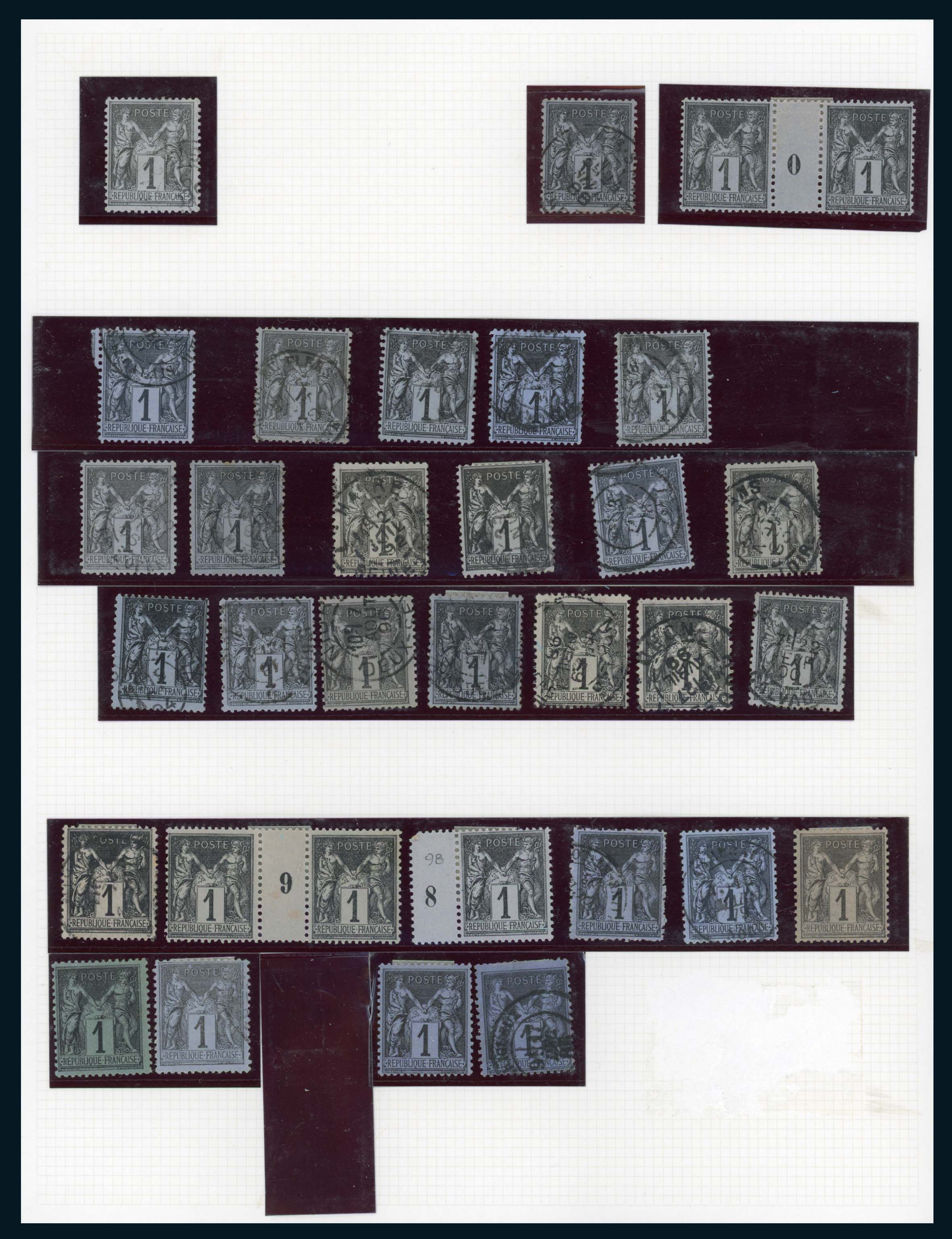 2410 | France, Collection de neufs et OB des origines aux années 30, composée de plusieurs timbres au même type, souvent avec des oblitérations différentes ou pour les neufs des variétés, bandes, blocs, millésimes (...), classiques très bien représentés (N°1 - 4 ex, N°2 - 3 ex, N°5, N°6 - 2 ex, N°9 - 2 ex, N°33 - 2 ex, emissions de 1853 et de Bordeaux bien représentées, type Sage avec quelques blocs et millésimes) très nombreuses bonnes valeurs dans les semi-modernes (Mouchon, Semeuses, Merson avec quelques variétés, N°182 - 2 ex, N°257A - 2 ex), exemplaires souvent choisis (nombreux classiques signés), nombreux millésimes, très forte cote, très bel ensemble constitué avec soin, à voir absolument Vous pouvez trouver l'ensemble des photos sur la page de la vente |