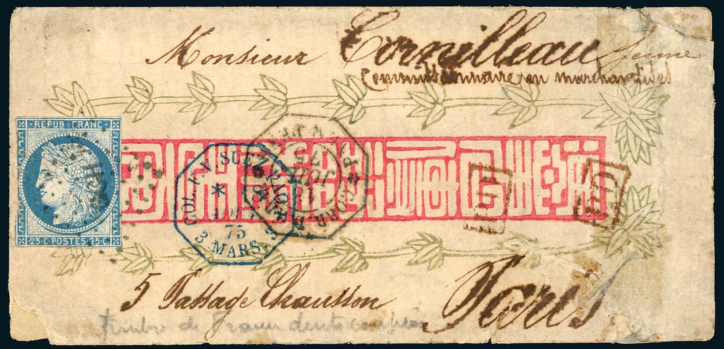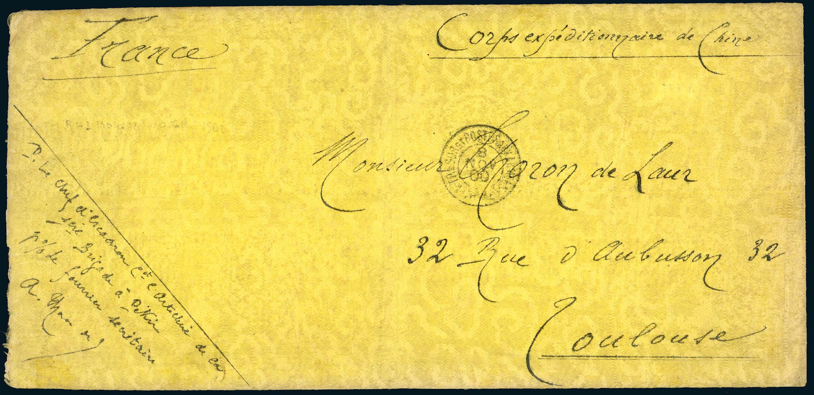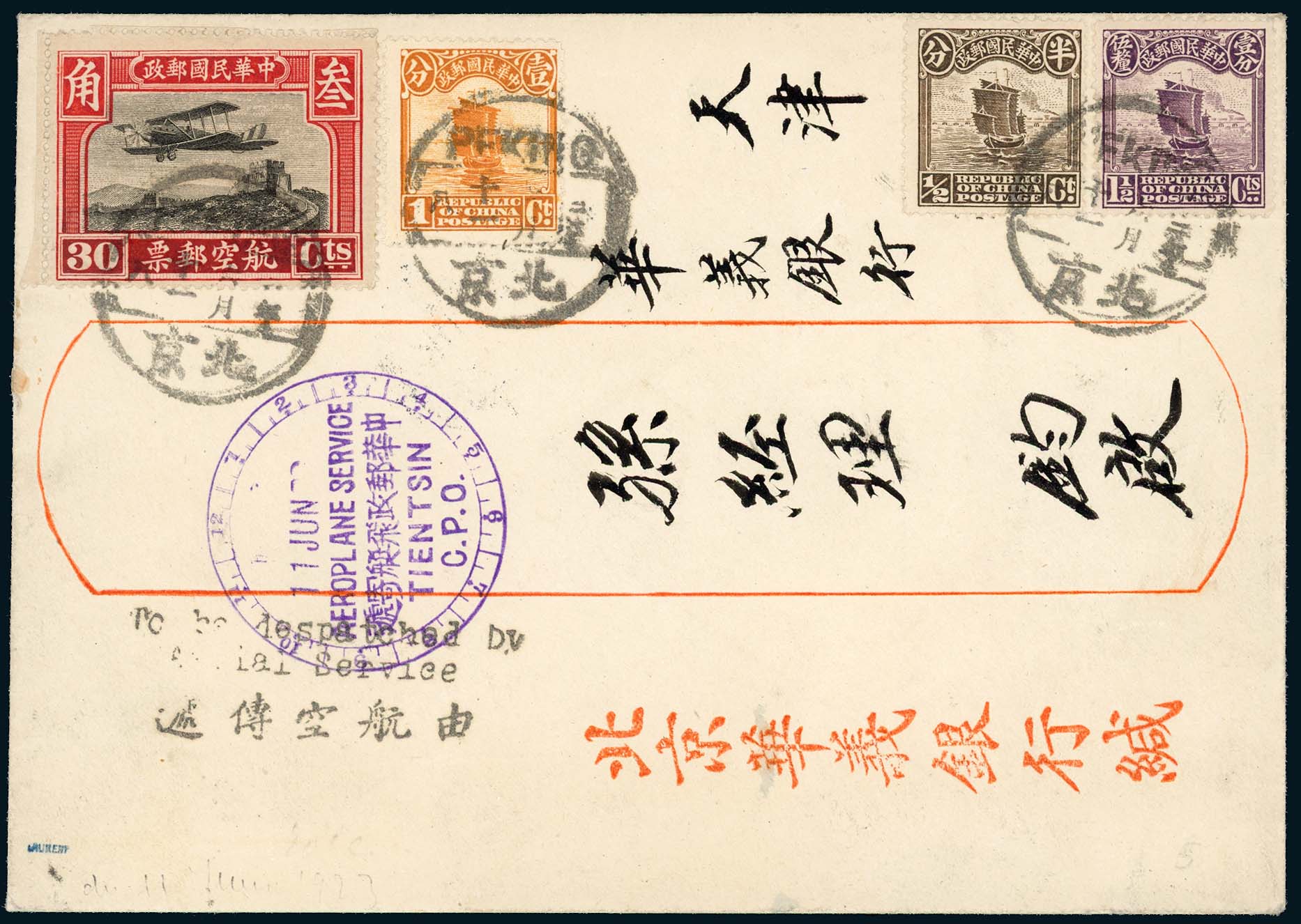 2392 | Chine, N°145A/147 et PA N°2 OB C. PEKING, C. 11 JUIN 1923/AEROPLANE SERVICE/TIENTSIN/CPO en violet sur enveloppe avec C. TIENTSIN au verso 11 juin 1923, pli très rare TB | 500 | 800 | 500 | enchérir | |