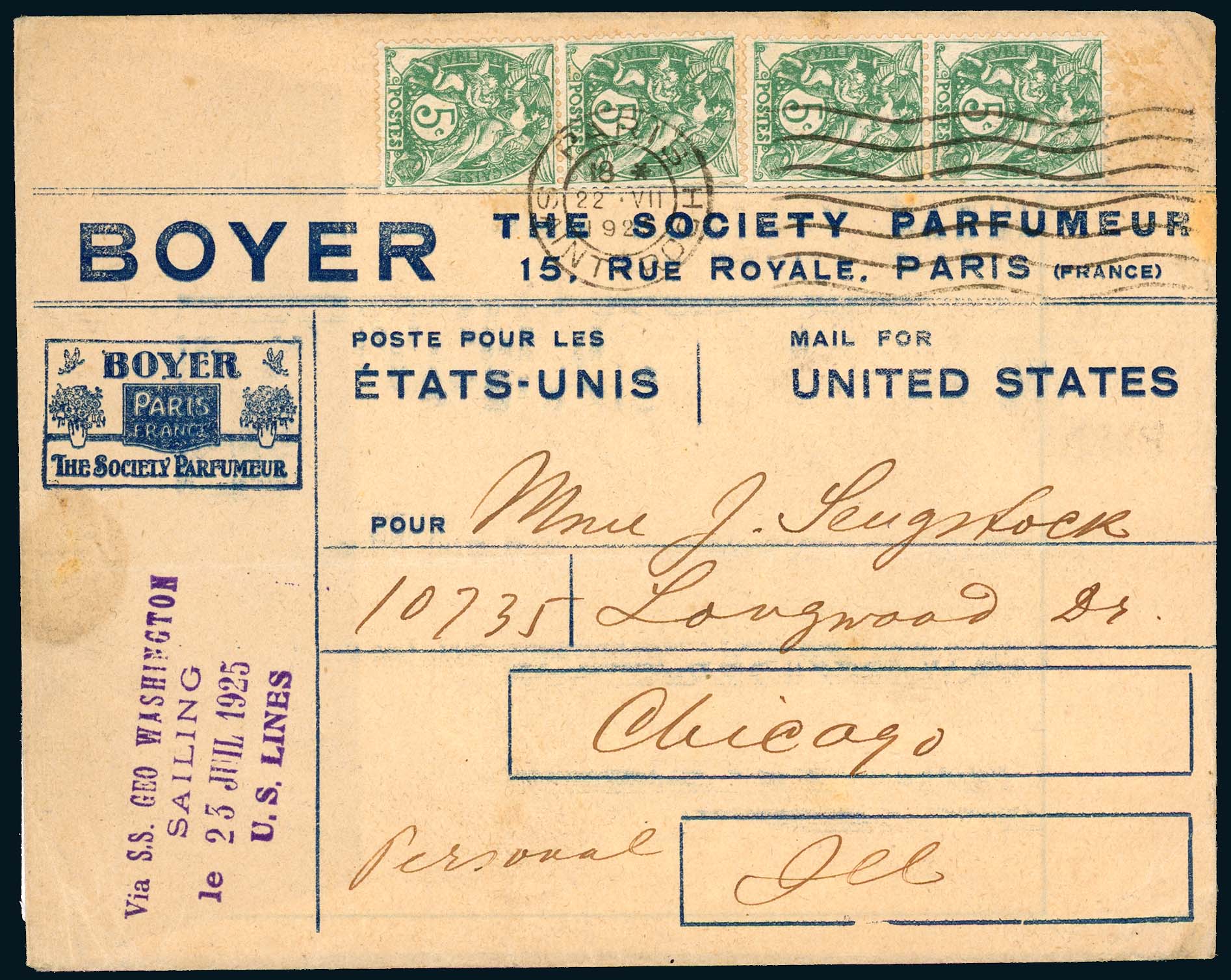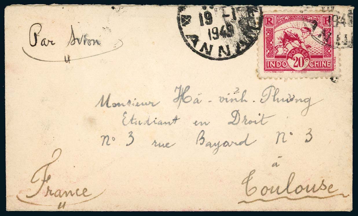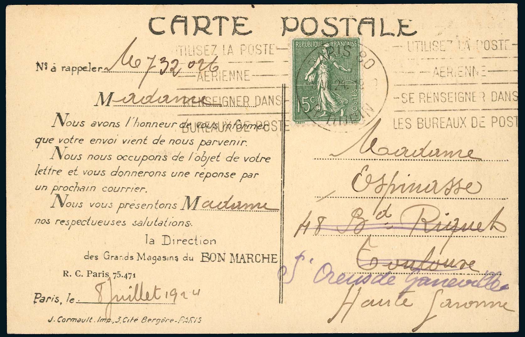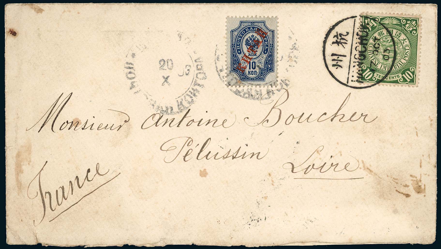 2392 | Chine, N°145A/147 et PA N°2 OB C. PEKING, C. 11 JUIN 1923/AEROPLANE SERVICE/TIENTSIN/CPO en violet sur enveloppe avec C. TIENTSIN au verso 11 juin 1923, pli très rare TB | 500 | 800 | 500 | enchérir | |