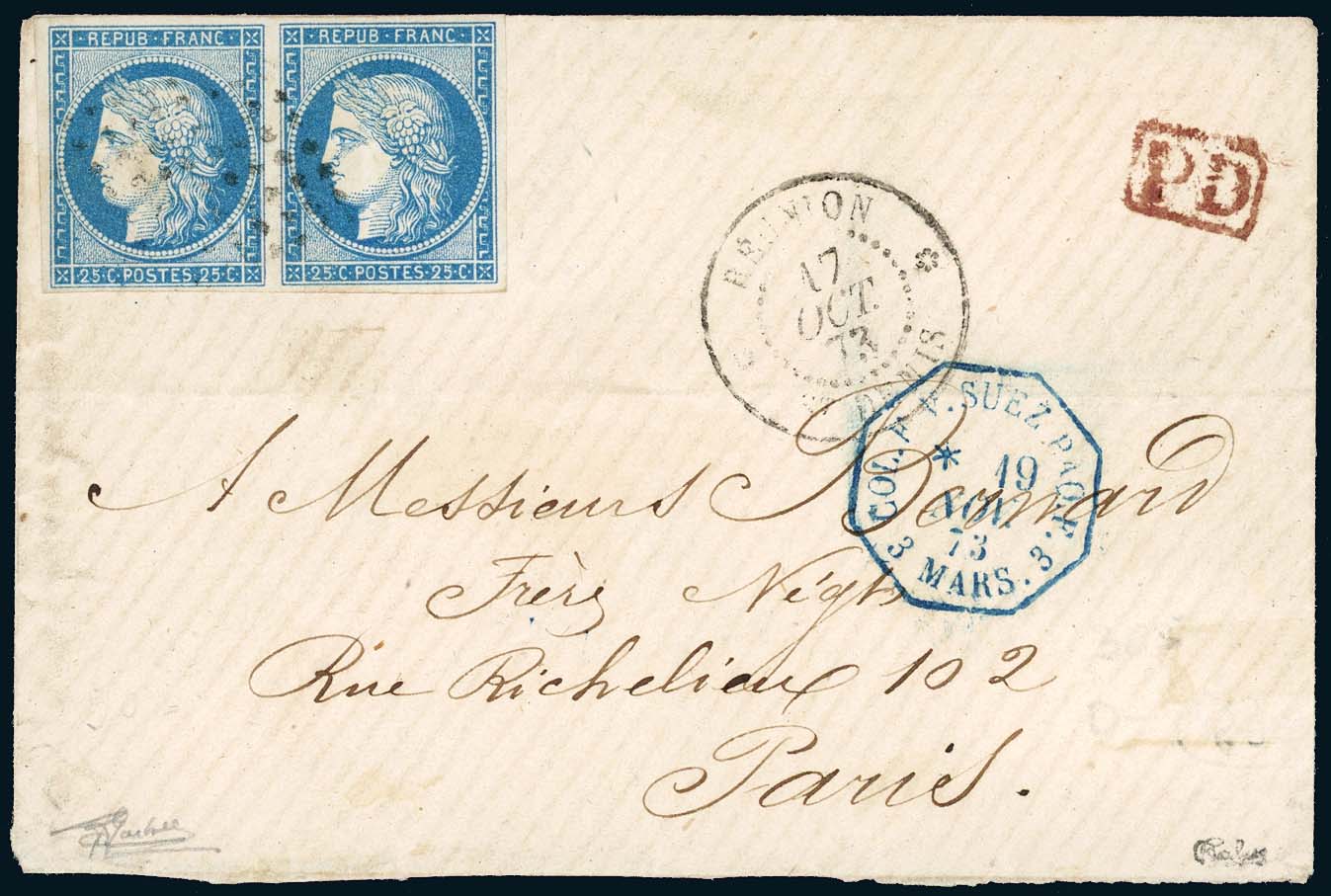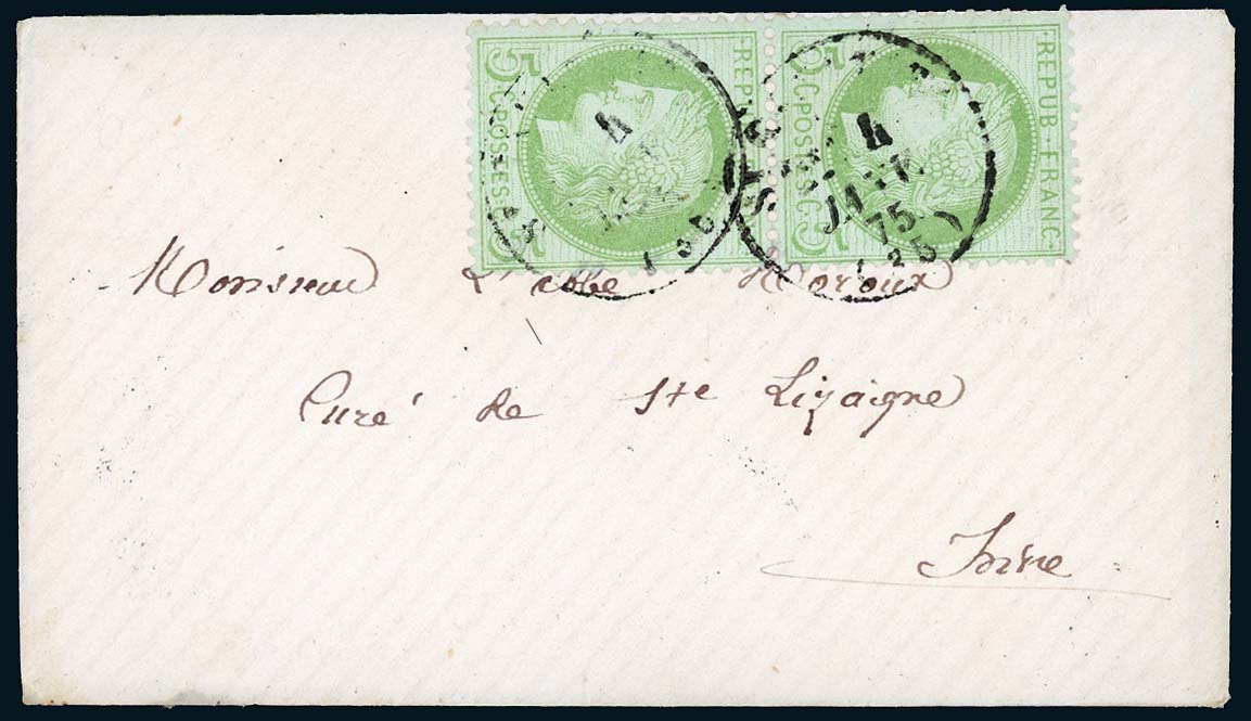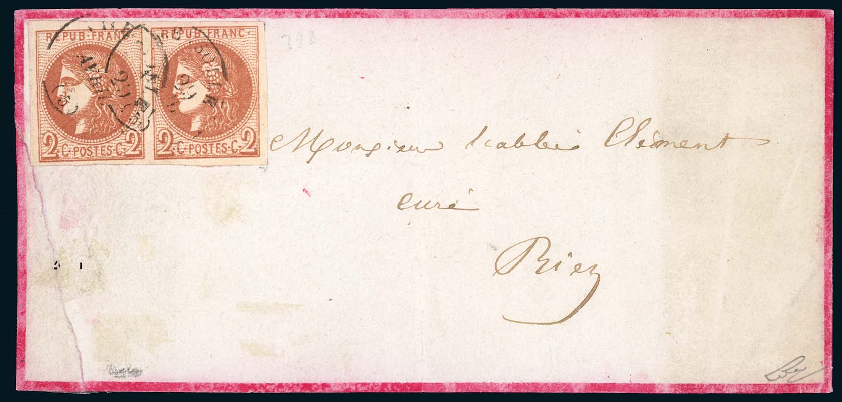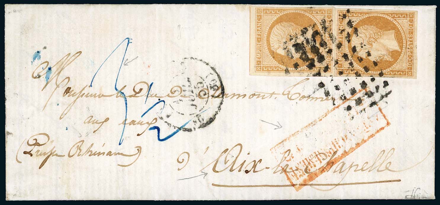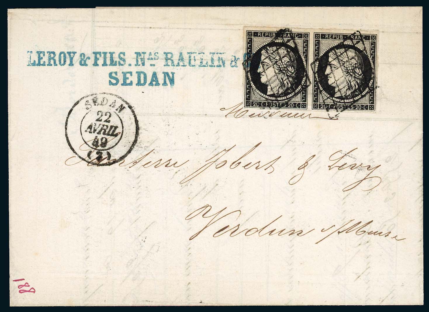 59 | N°3 en paire OB grille, C. SEDAN su lettre pour Verdun avec C. d'arrivée au verso 1849 Double port TB | 125 | 200 | 125 | enchérir | |