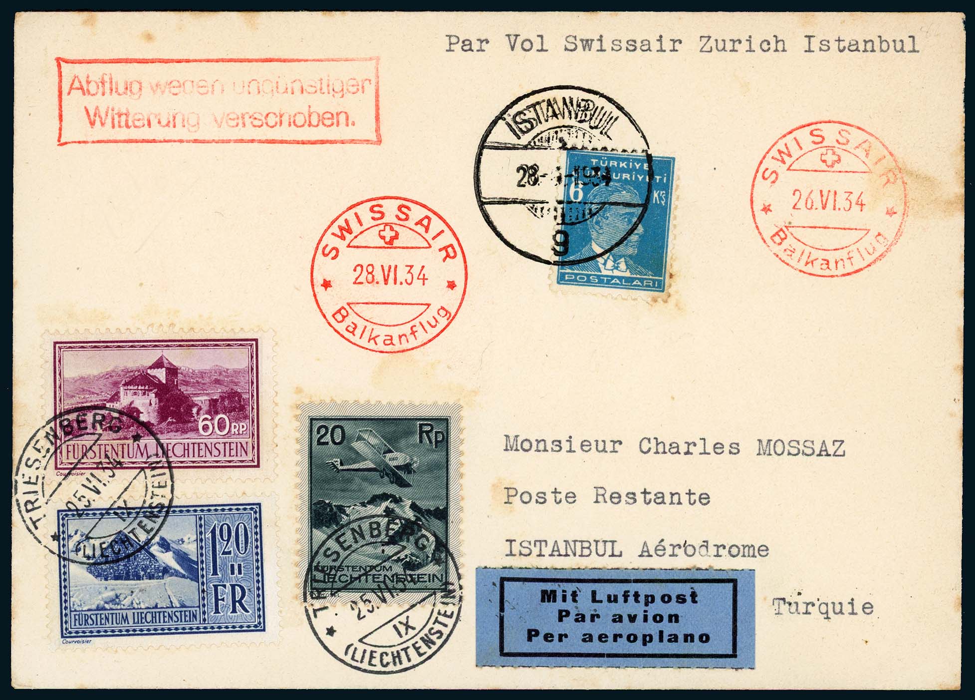 2397 | Liechstenstein, Premiers vols (4) par la Swissair vers Belgrade, Istamboul, Naples et Zurich avec C. Notlanndung (28/6/1934) TB | 750 | 1000 | 750 | enchérir | |