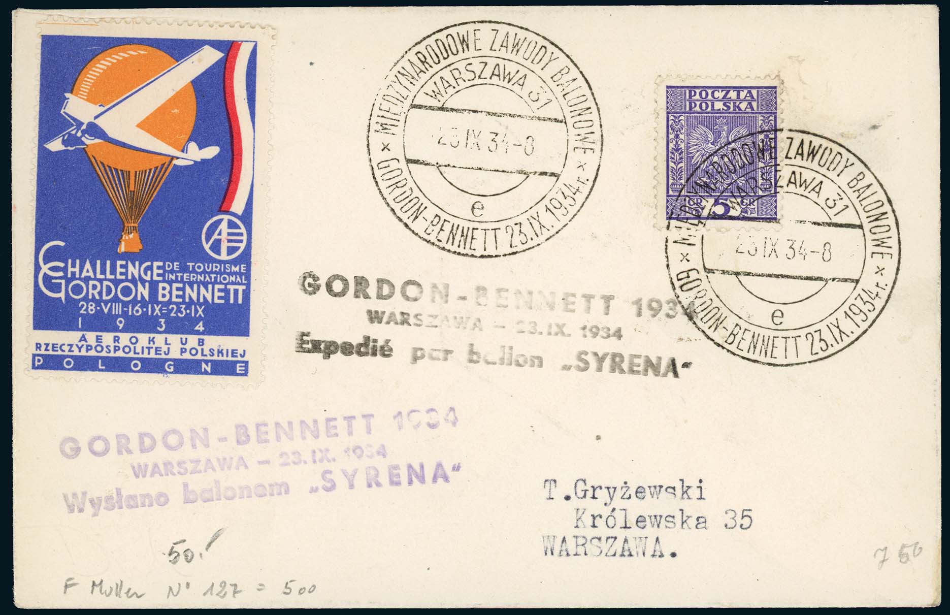 2401 | Poste Aérienne, Pologne, Varsovie, Coupe Gordon Bennett (Muller 127) 23/9/1934 TB | 15 | 30 | 15 | enchérir | |