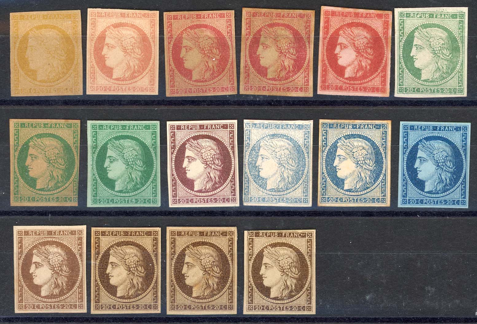 3 | N°3, 20 centimes, ensemble de 16 essais de couleurs, nuances et couleurs différentes TB | 100 | 200 | 100 | enchérir | |