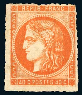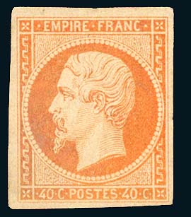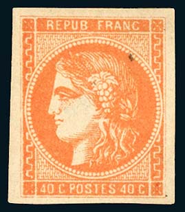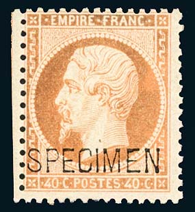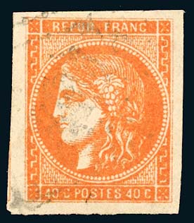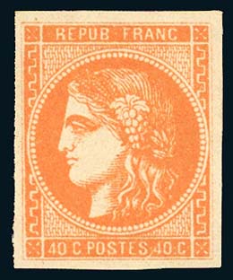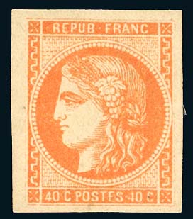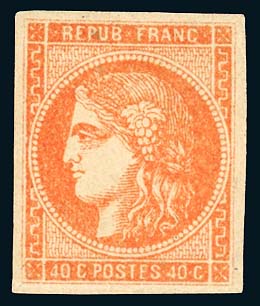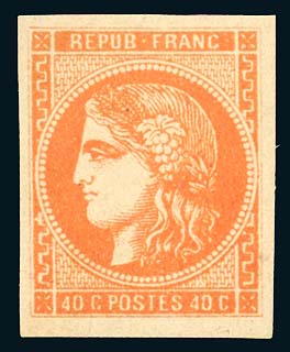 6 | N°5, 40 centimes, Lot de 3 essais de couleurs (rose, bistre et orange sur bleuté) TB | 40 | 80 | 40 | enchérir | |