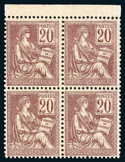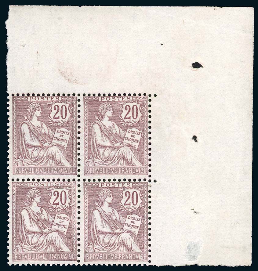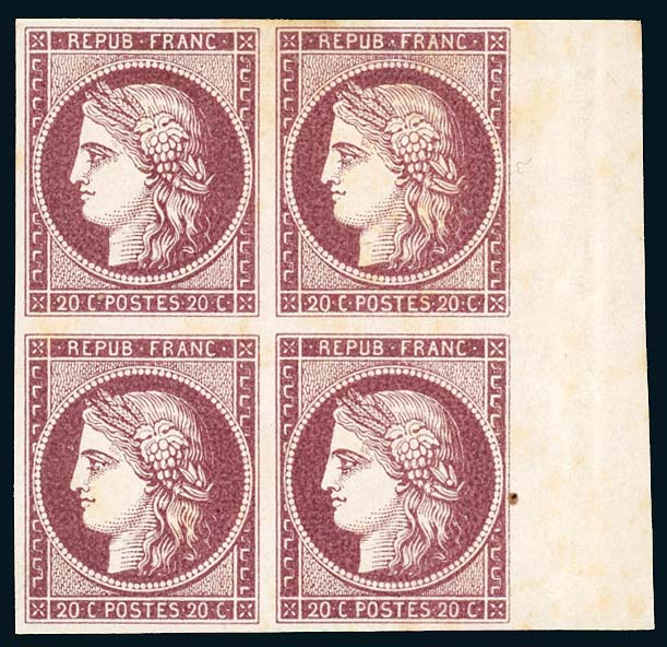 4 | N°3, 20 centimes, ensemble de 3 essais de de couleurs en blocs de 4 (lilas, brun et orange) TB | 150 | 300 | 150 | enchérir | |