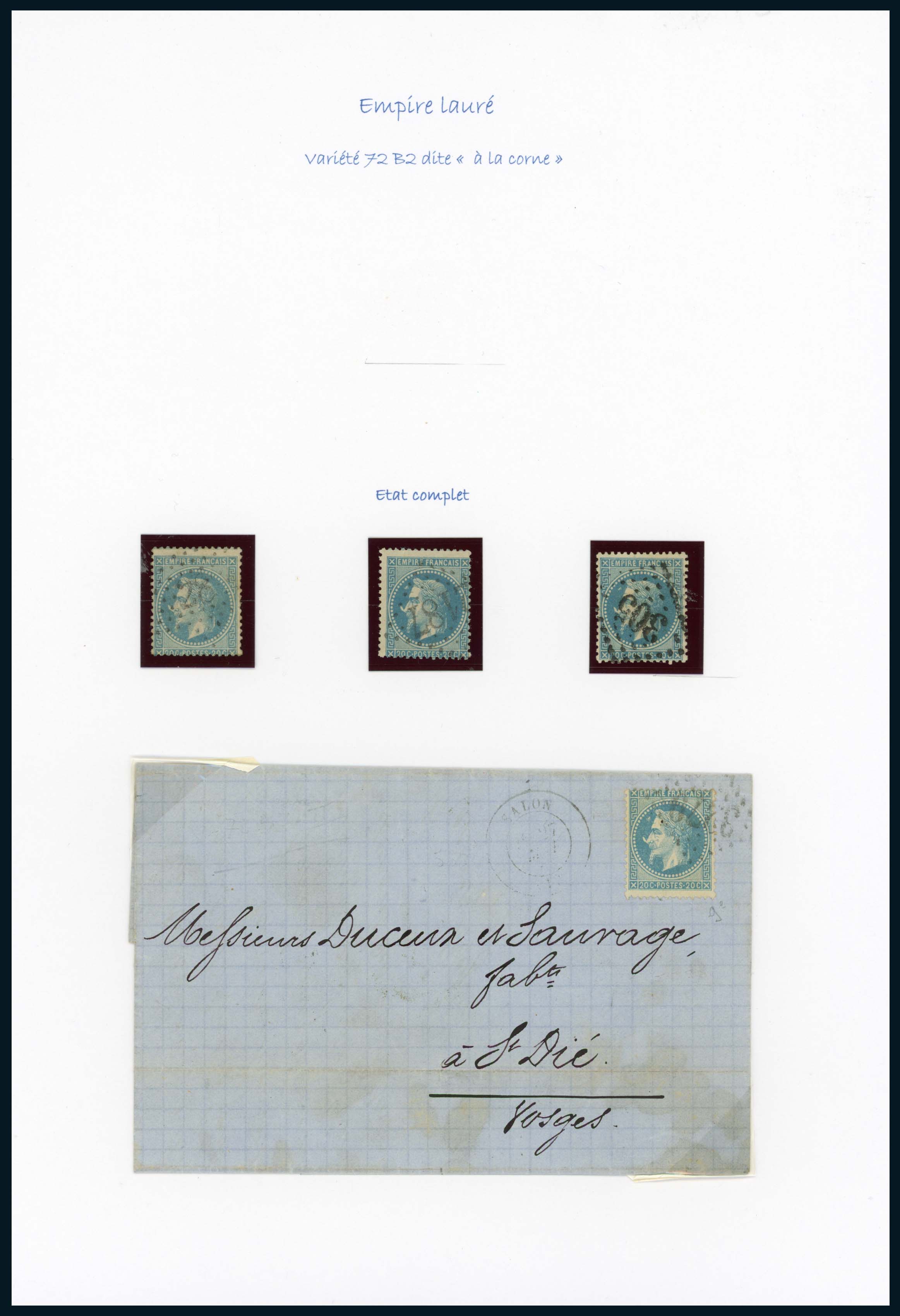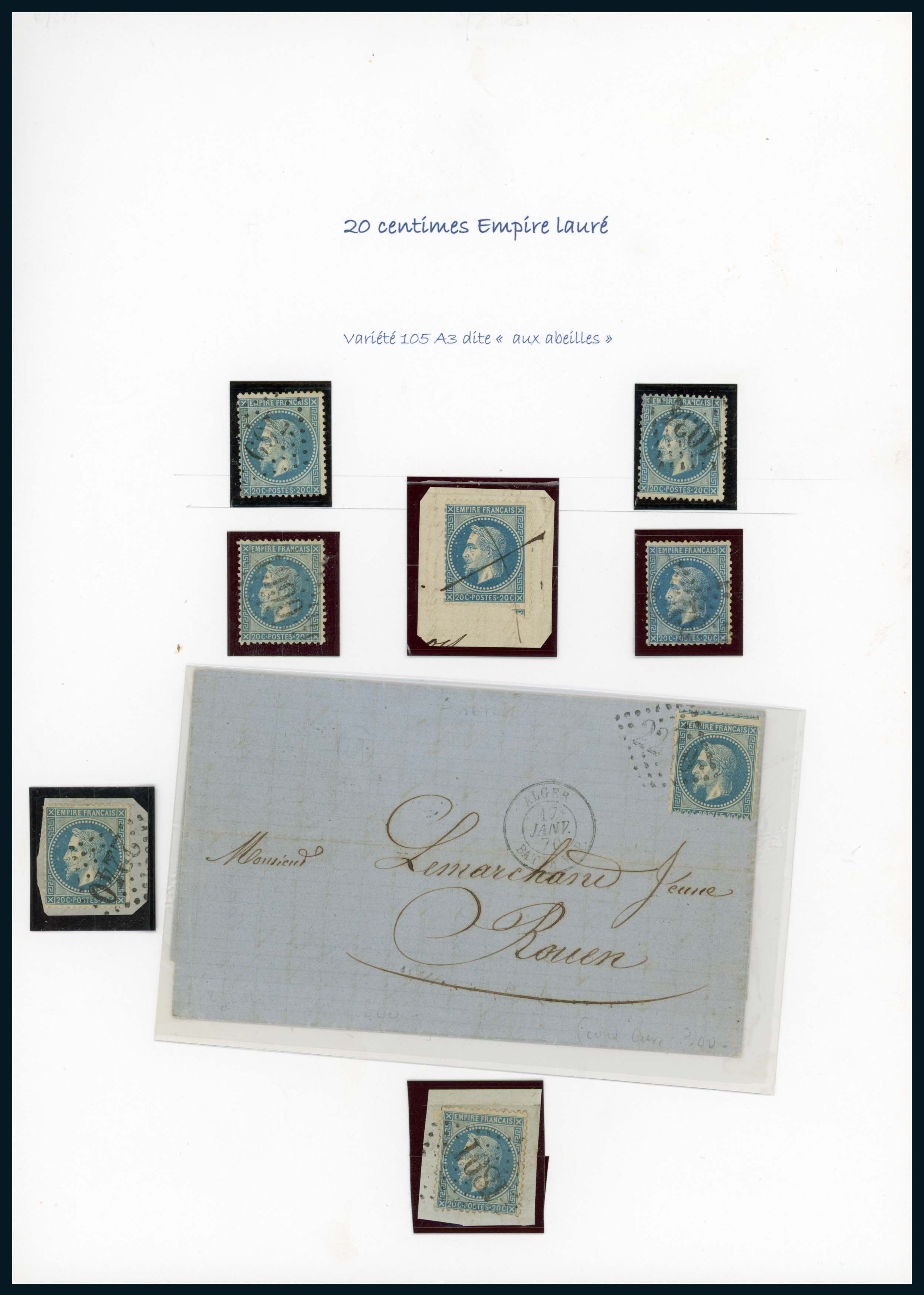 2421 | Bleus, Classeur de variétés dont la corne et 2 états de la pipe, N°14 bleu s/lilas et sur vert, 38 "4" retouché et divers, à voir | 150 | 300 | 150 | enchérir | |