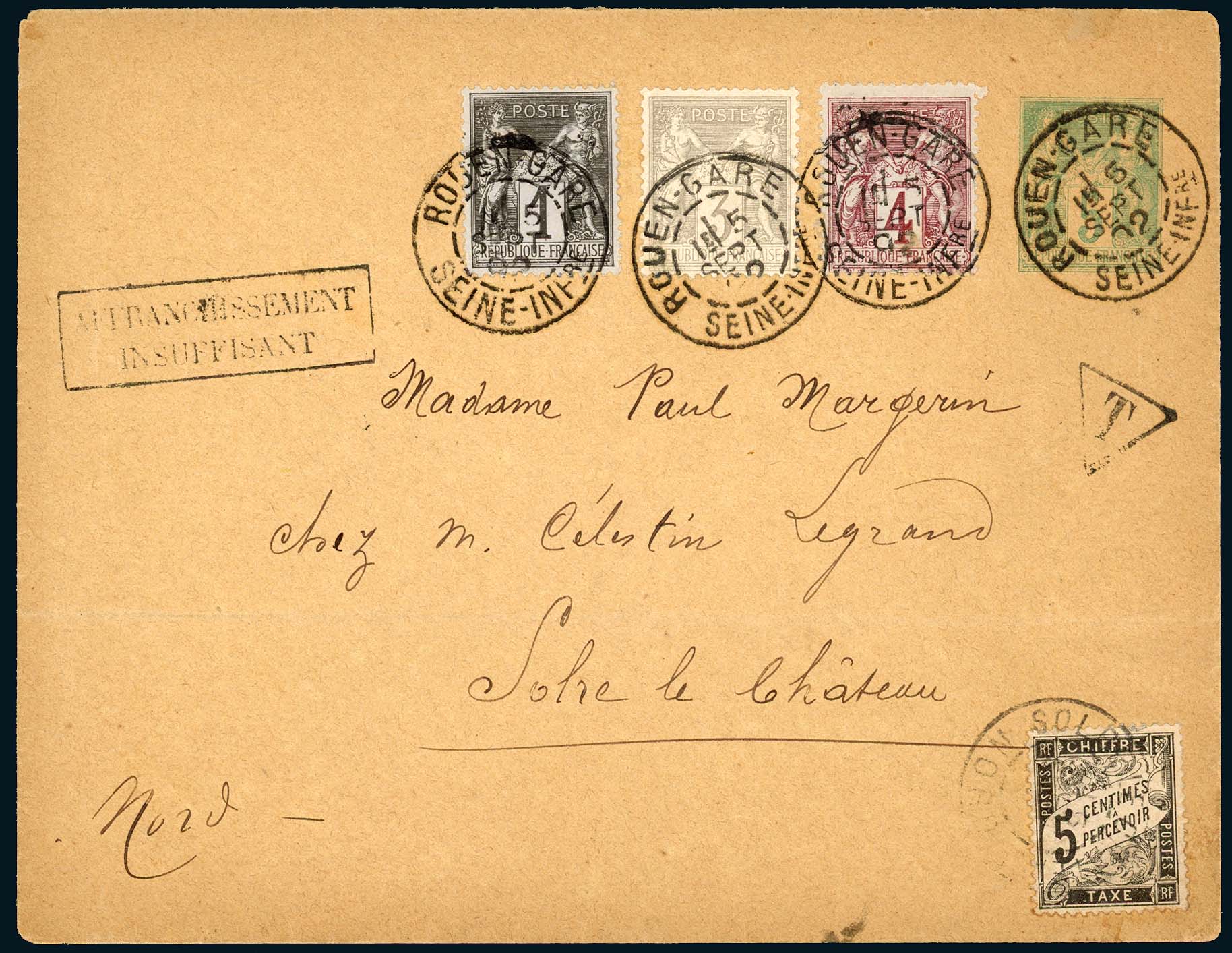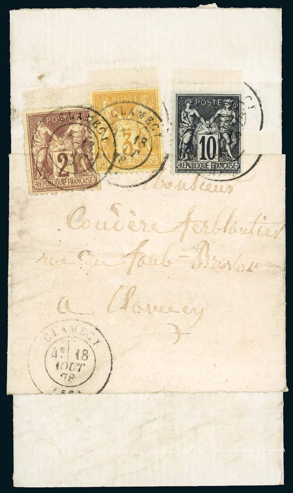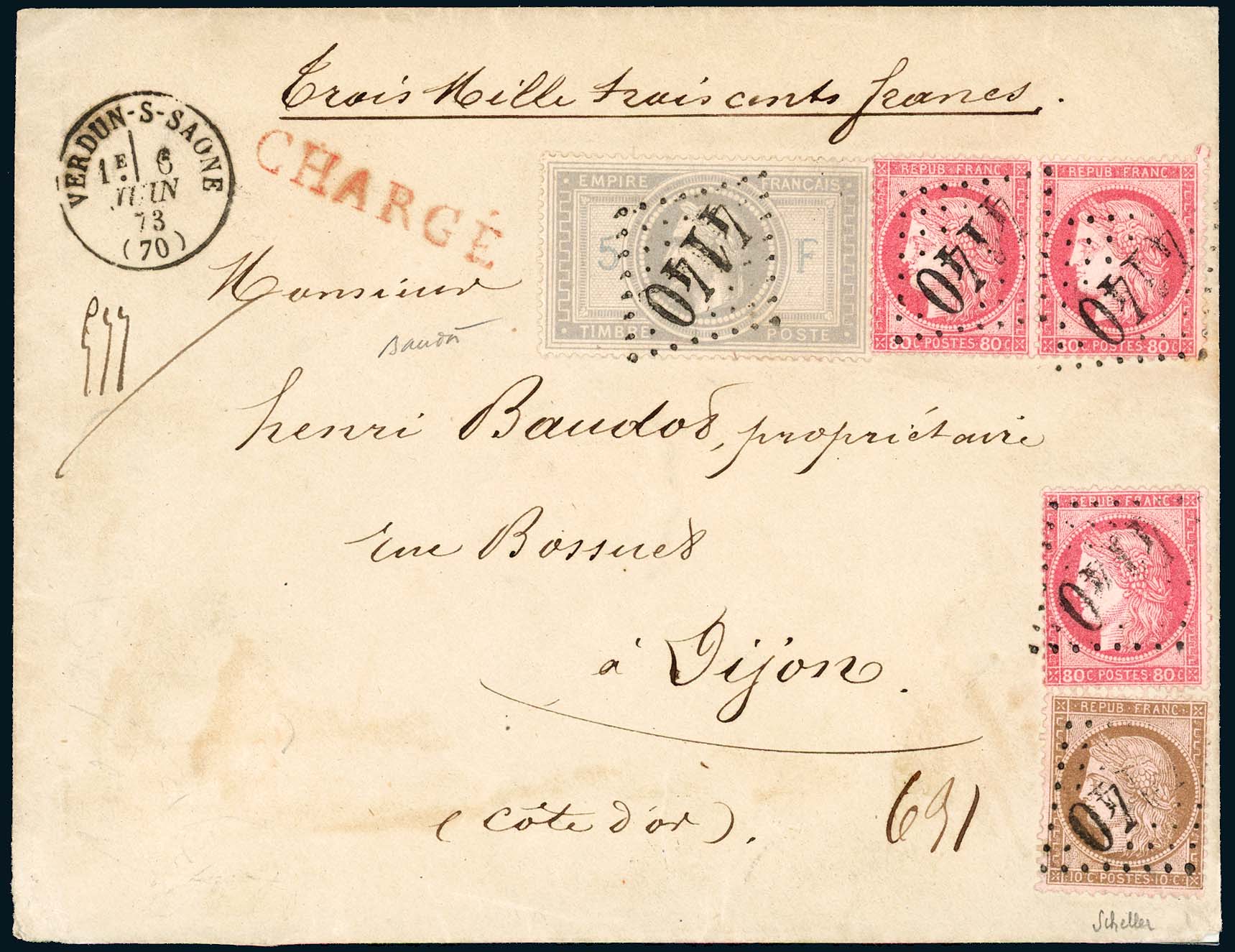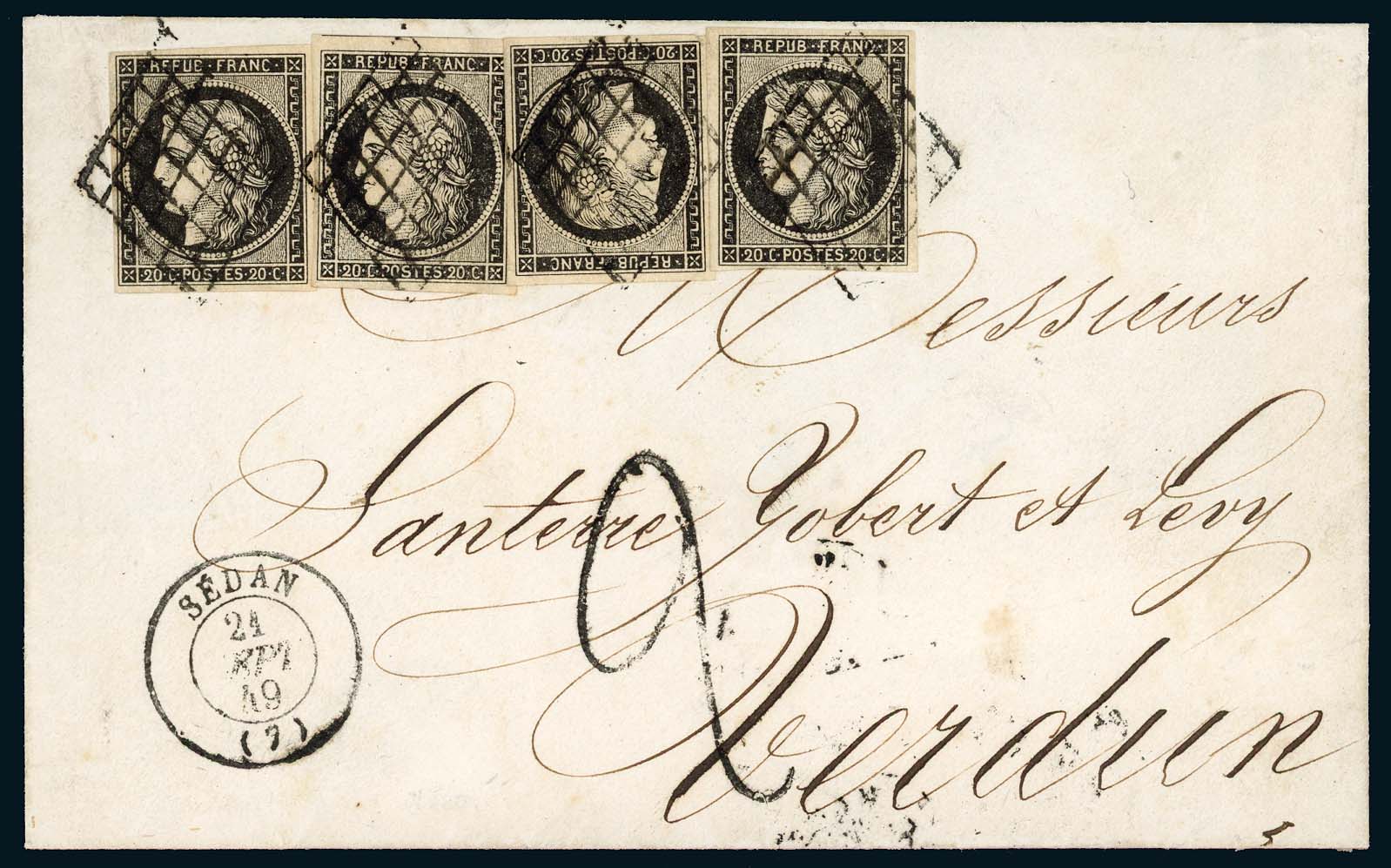 68 | N°3, 4 exemplaires, OB grille, C. SEDAN sur enveloppe taxée 2 au tampon pour Verdun, taxée pour complément d'affranchissement à 1fr au tarif du triple port de bureau à bureau, belle combinaison 1849 TB | 75 | 150 | 75 | enchérir | |