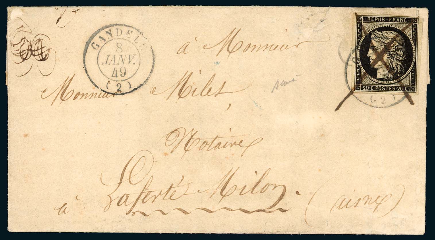 48 | N°3 OB C. GANDELU (type 15) et plume sur lettre de de Montigny-Ballier avec boite rurale F (en partie sous le timbre-poste) à destination de La Ferté-Milon avec arrivée au verso 8 janvier 1849 Rare cas d'une lettre d'origine rurale affranchie au bureau de poste TB | 200 | 400 | 200 | enchérir | |