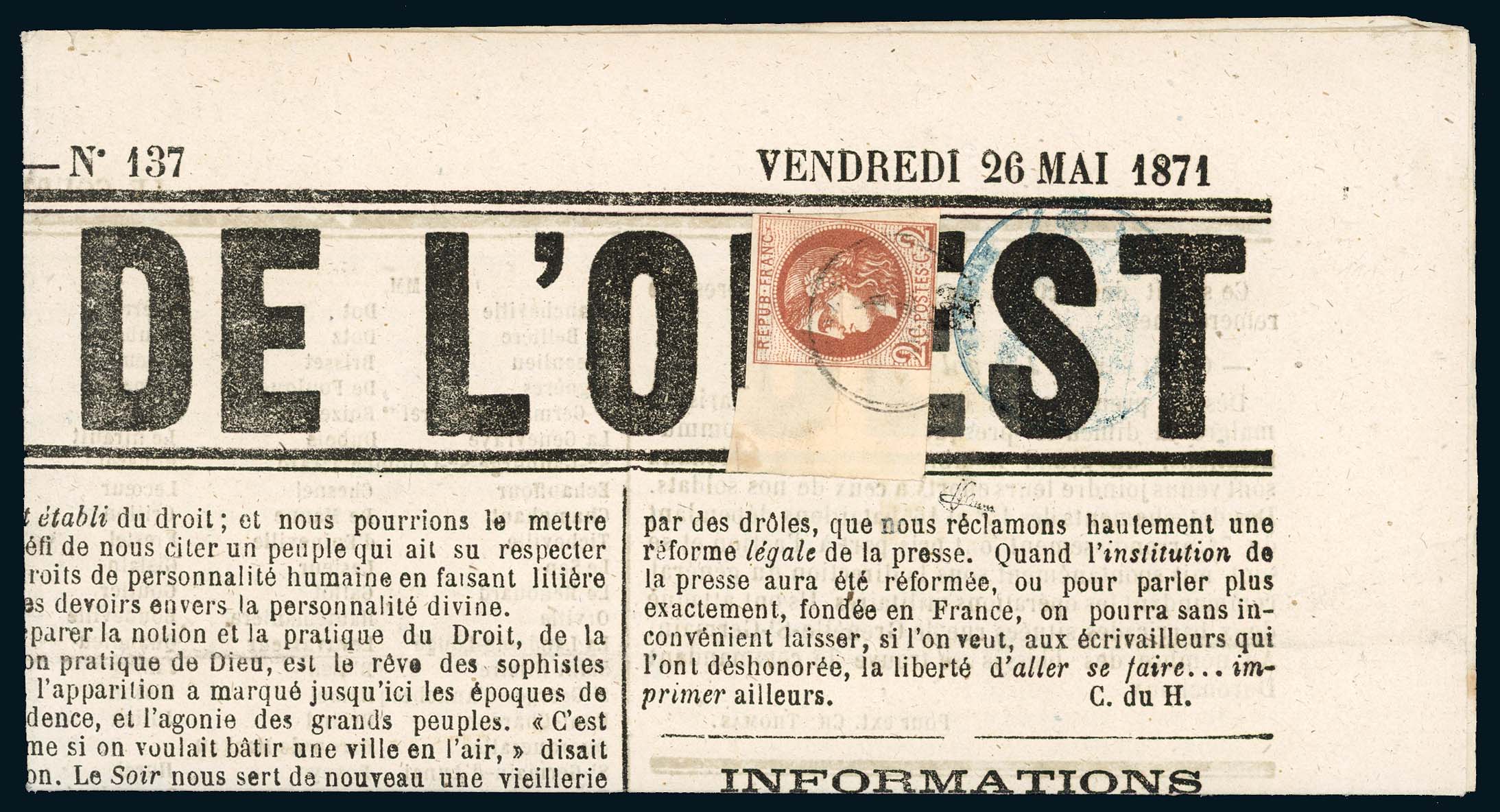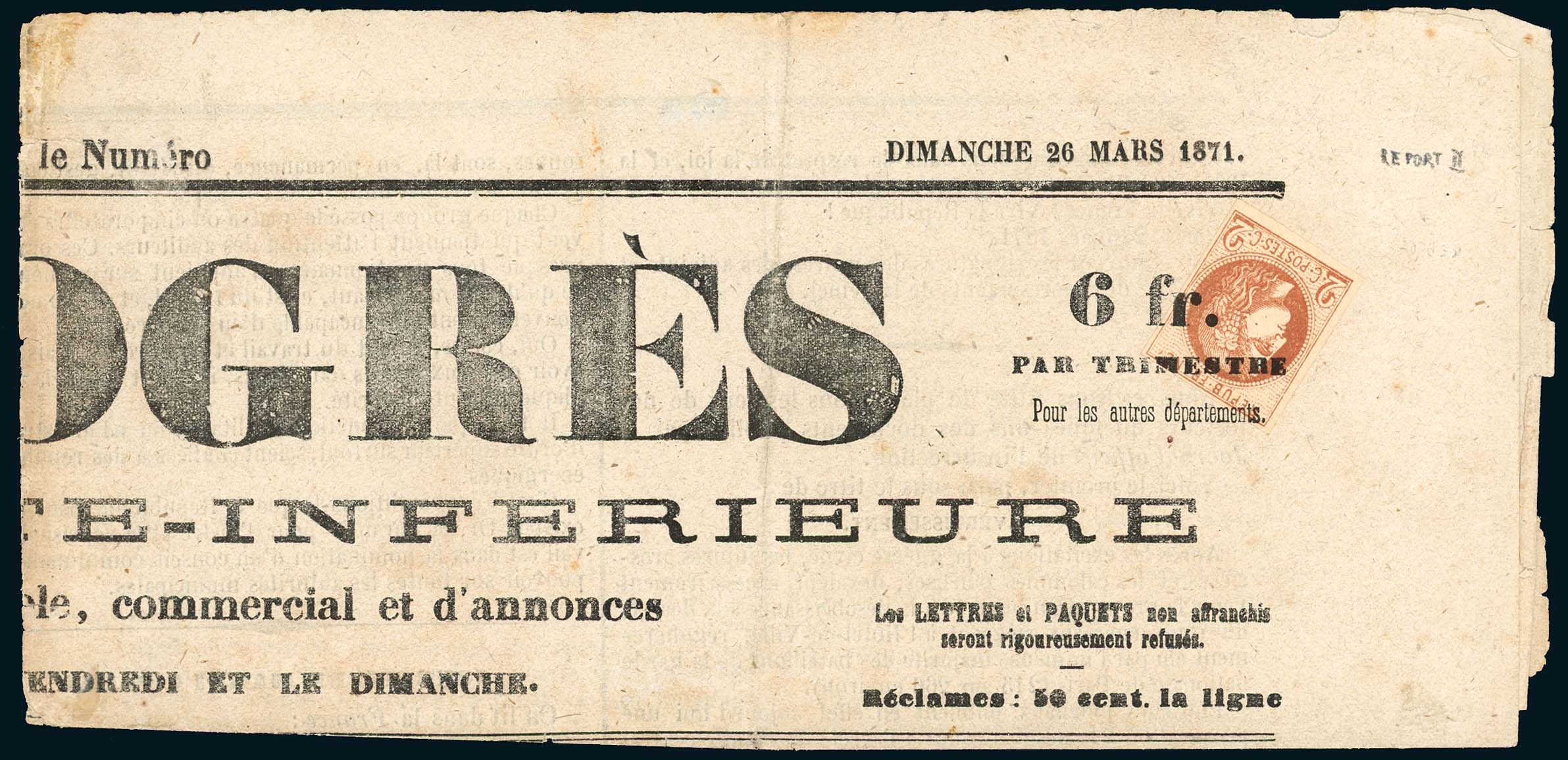 31 | N°2 (touché) OB grille, C. "Lev. de 2 1/2S/Don de 7h M/PP/J" en rouge sur lettre locale de Paris avec C. PARIS au verso 1850 Rare B/TB | 100 | 200 | 100 | enchérir | |
