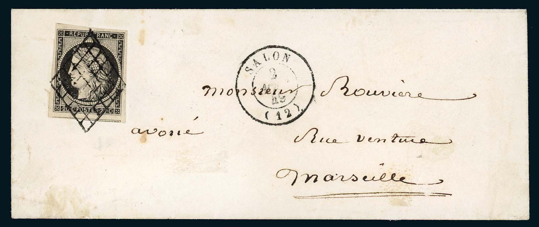 55 | N°3 OB grille sur enveloppe de Salon pour Marseille 1849 TB/Sup | 60 | 120 | 60 | enchérir | |