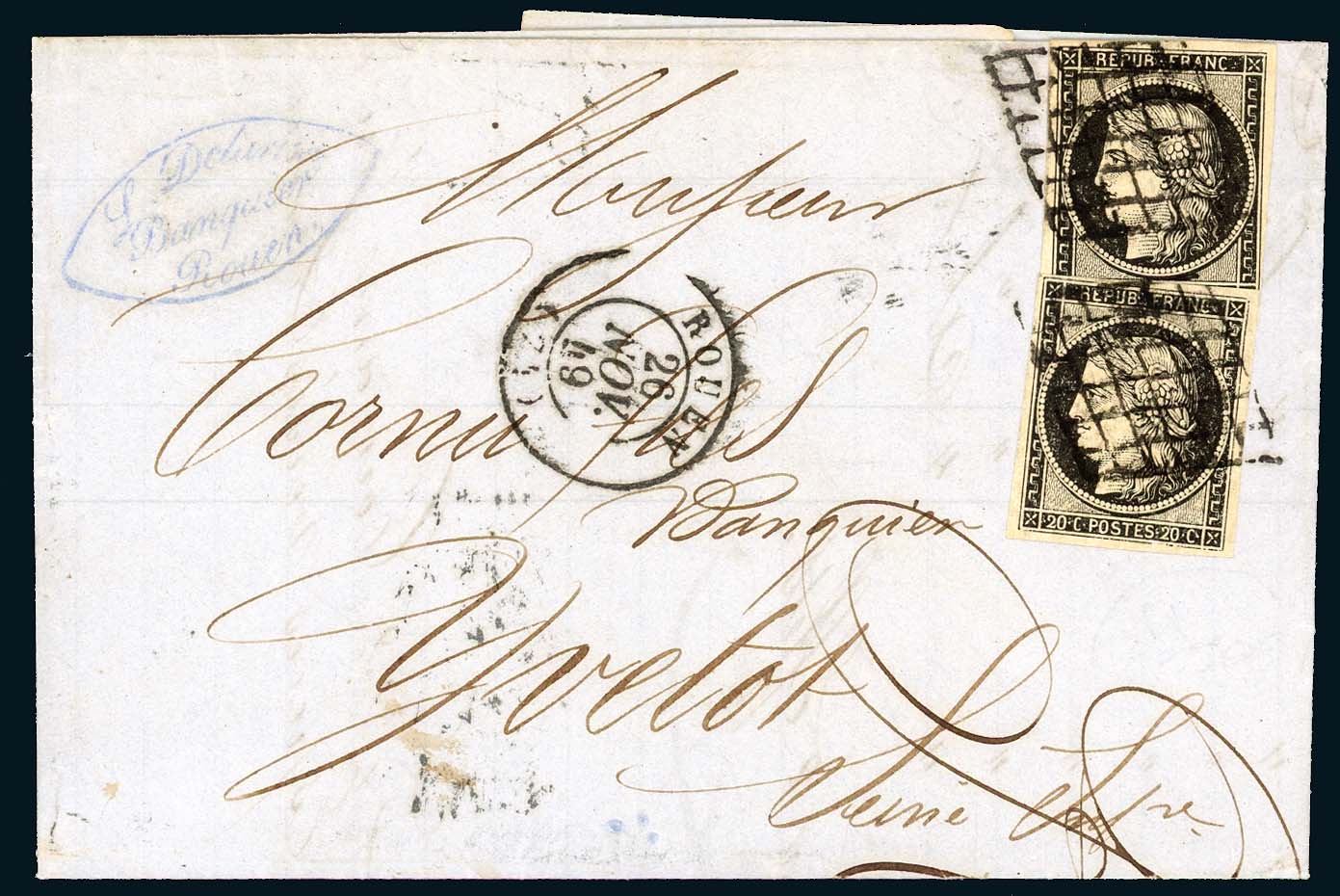 66 | N°3, 2 ex. bien margés OB grille, C.15 ROUEN du 26 novembre 1849 sur lettre pour Yvetot TB | 75 | 150 | 75 | enchérir | |