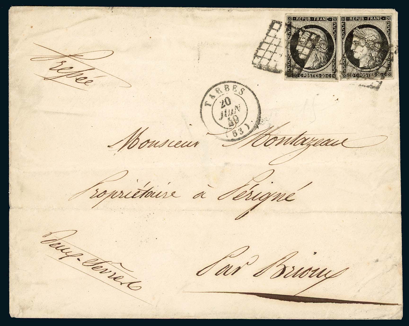 67 | N°3, 2 exemplaires, OB grille, C. TARBES (type 15) sur enveloppe au double port pour Brioux 1849 TB | 50 | 100 | 50 | enchérir | |