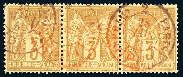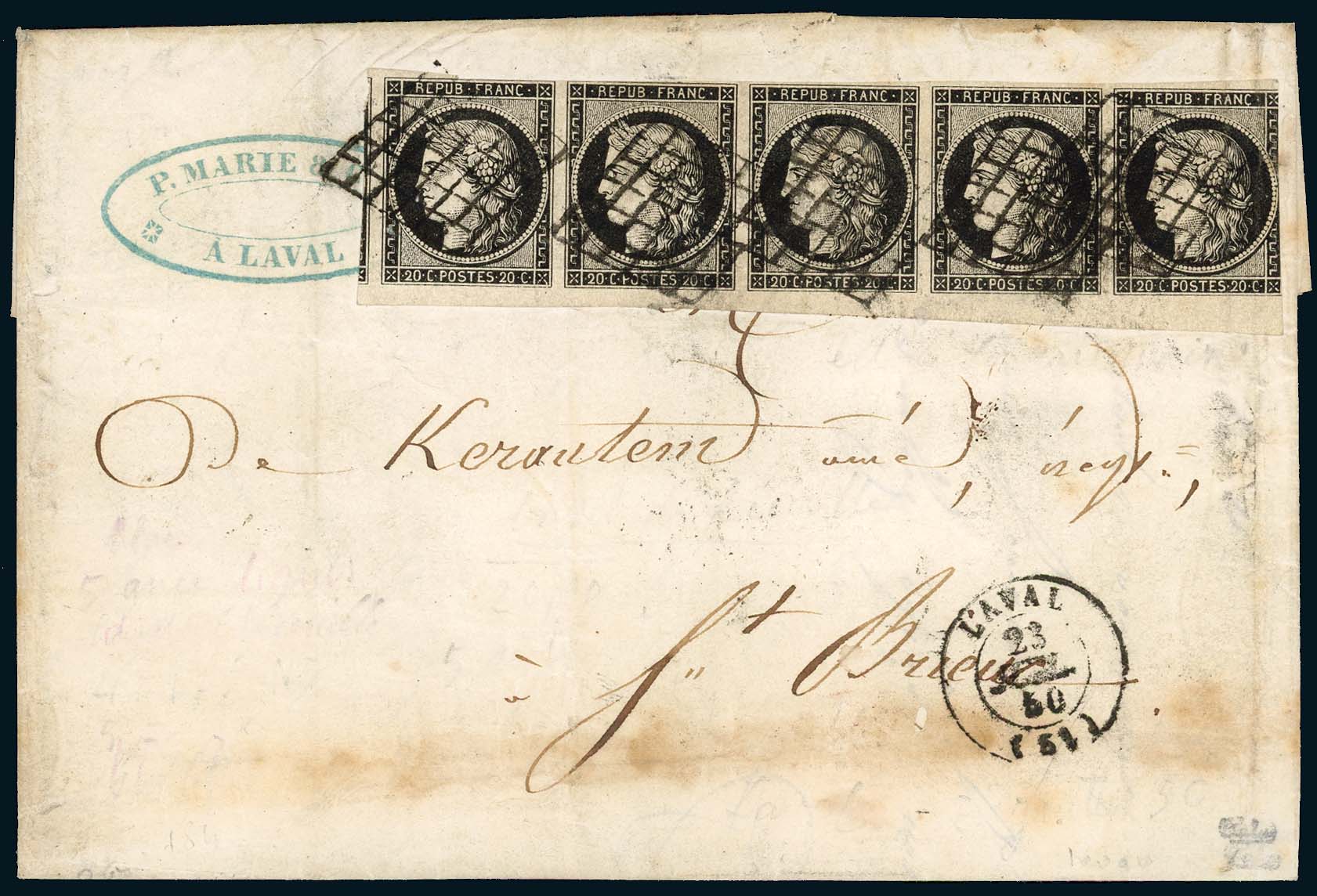 69 | N°3 en bande de 5 bas de feuille (1 ex touché) OB grille, C. LAVAL sur lettre au triple port pour St Brieux, signé Calves 1850 TB | 150 | 250 | 150 | enchérir | |