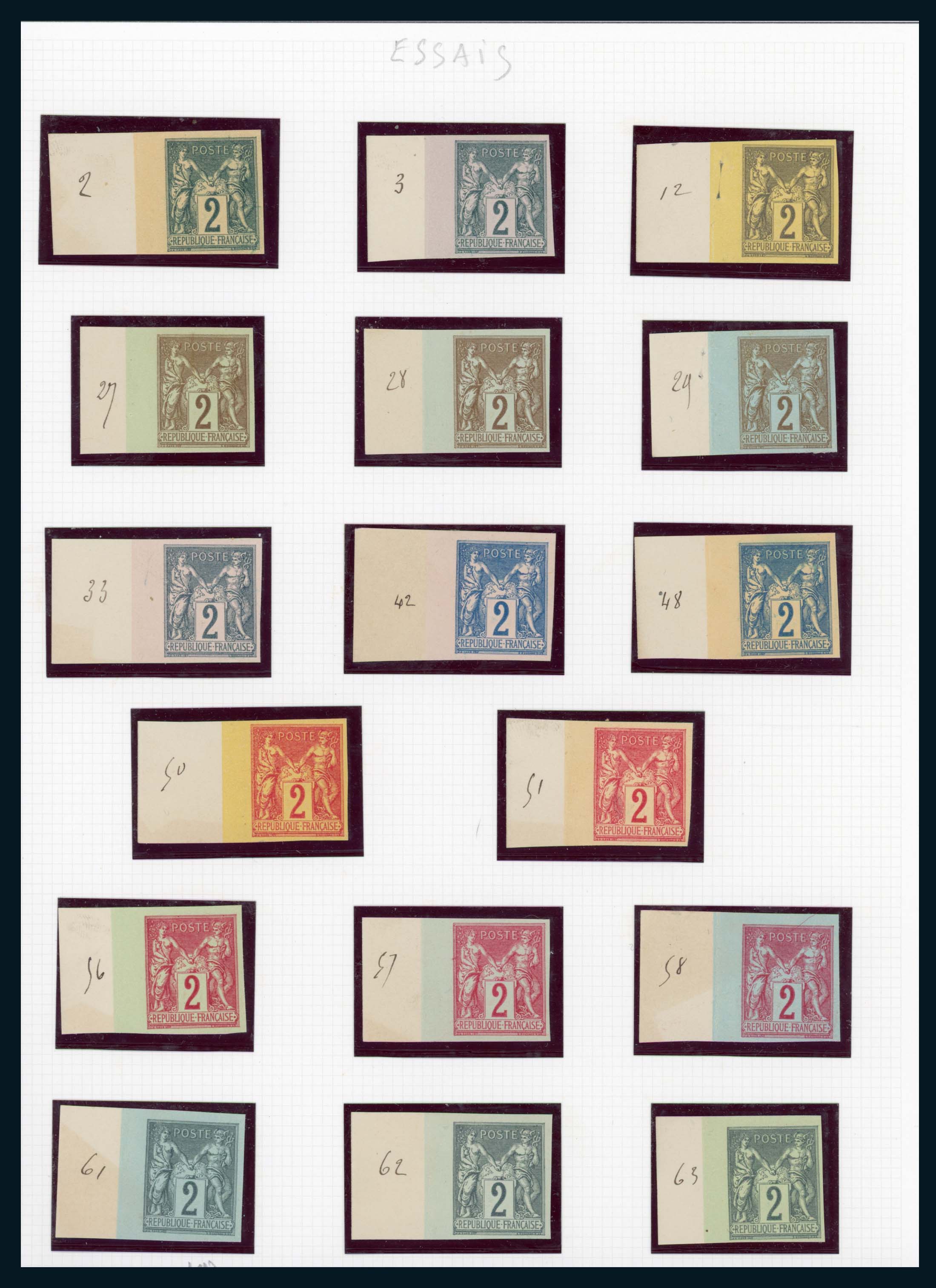 2 | N°2, 15 centimes, Lot de 3 essais de couleurs (vert, bistre sur verdâtre et bleu) TB | 60 | 120 | 60 | enchérir | |
