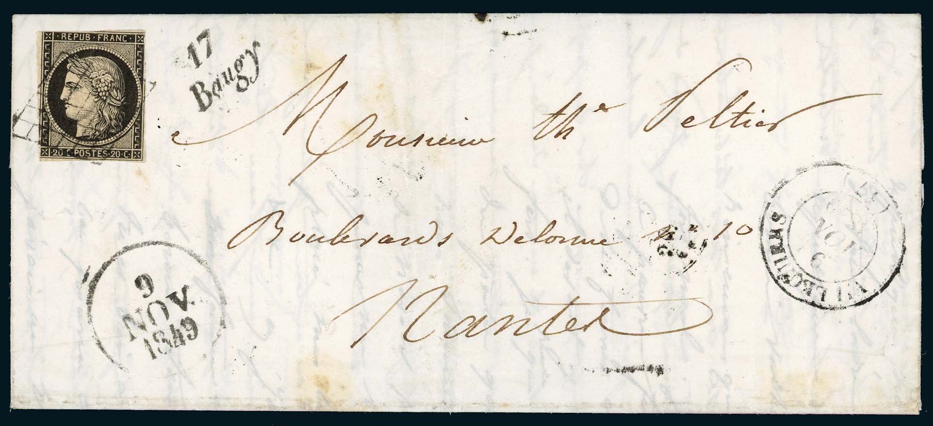 75 | N°3 (défectueux) OB grille, C. VILLEQUIERS, cursive 17/Baugy et bloc dateur A sur lettre pour Nantes avec C. de passage et d'arrivée au verso 9 novembre 1849 Combinaison rare B/TB | 75 | 150 | 75 | enchérir | |