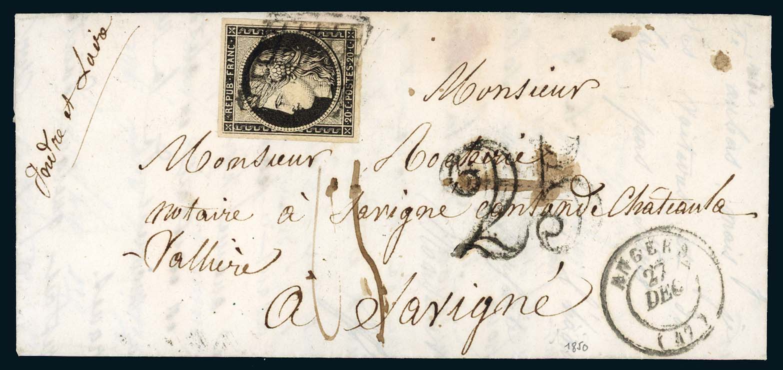 86 | N°3 OB grille, C. ANGERS sur lettre pour Savigné taxée 25 double trait par erreur et corrigé 05 à la plume 1850 TB | 60 | 120 | 60 | enchérir | |